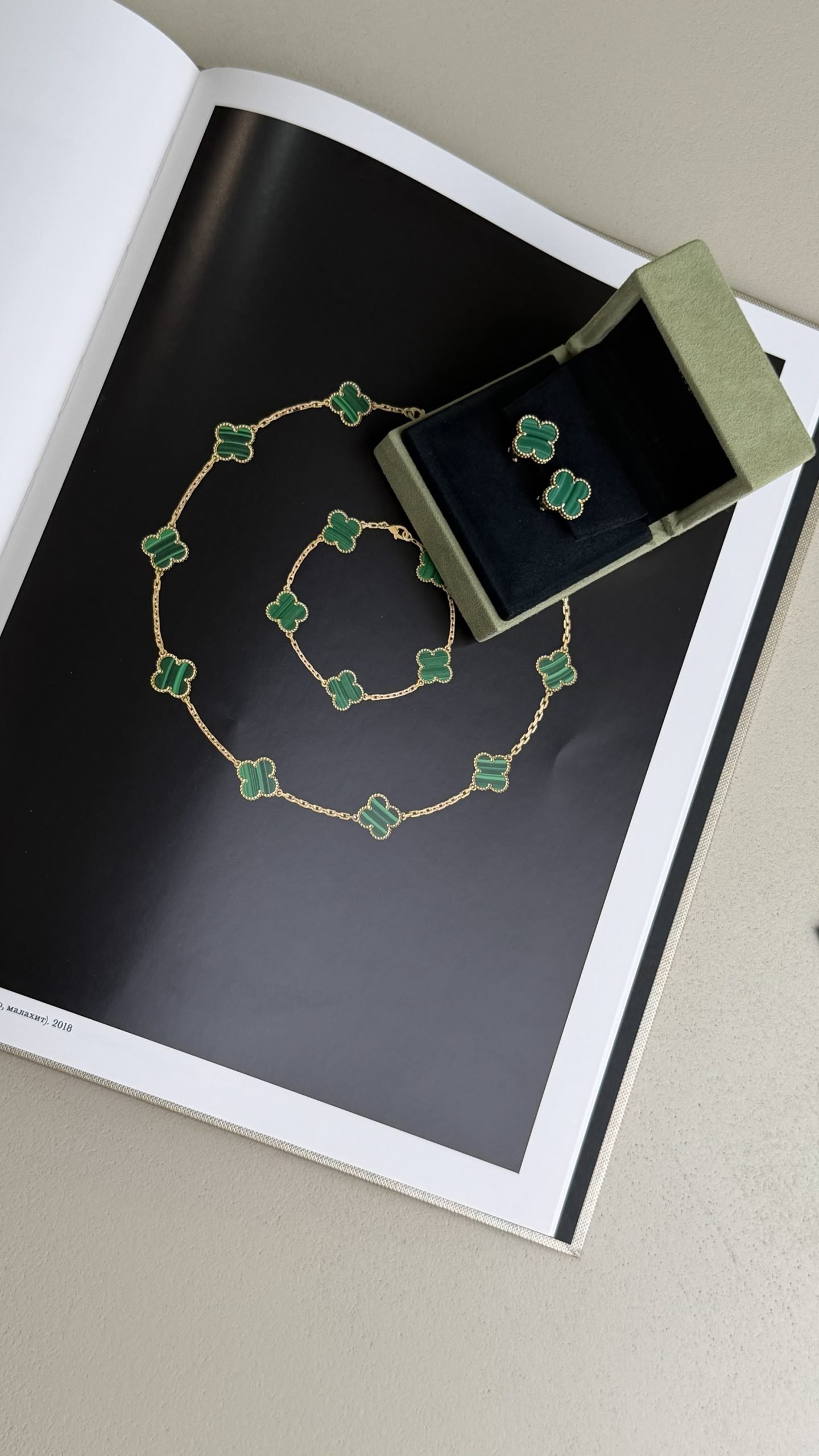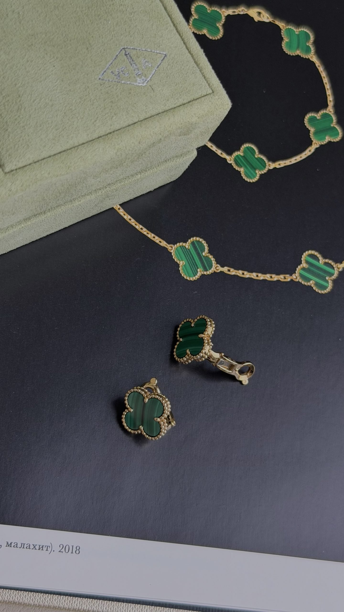 Фірмовий чотирилисний мотив обрамлений золотою зернистою окантовкою perlée, яка є впізнаваним ювелірним кодом Дому Van Cleef & Arpels. Насичений зелений малахіт у поєднанні з жовтим золотом створює розкішний, статусний акцент, що миттєво притягує погляди.
