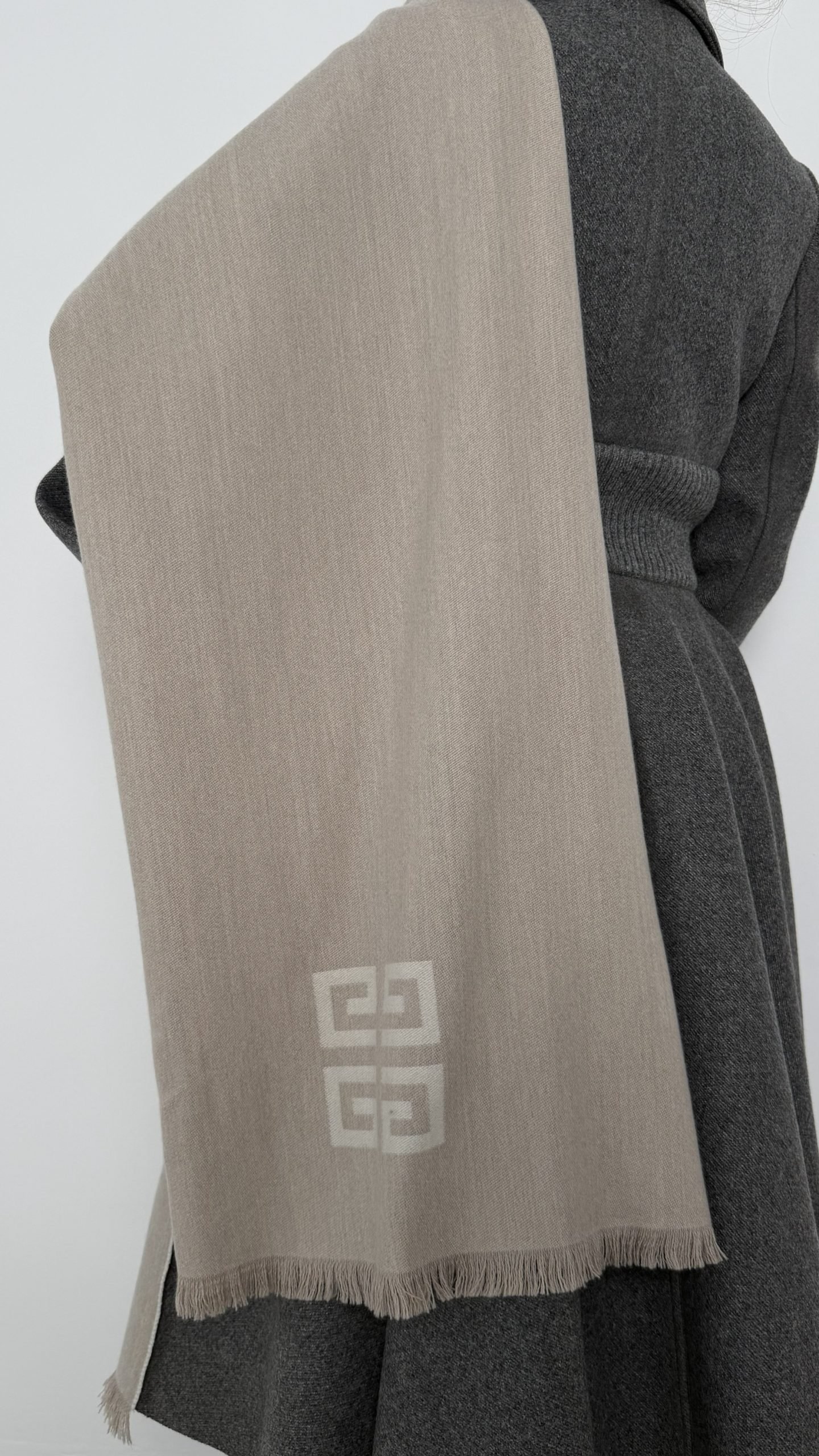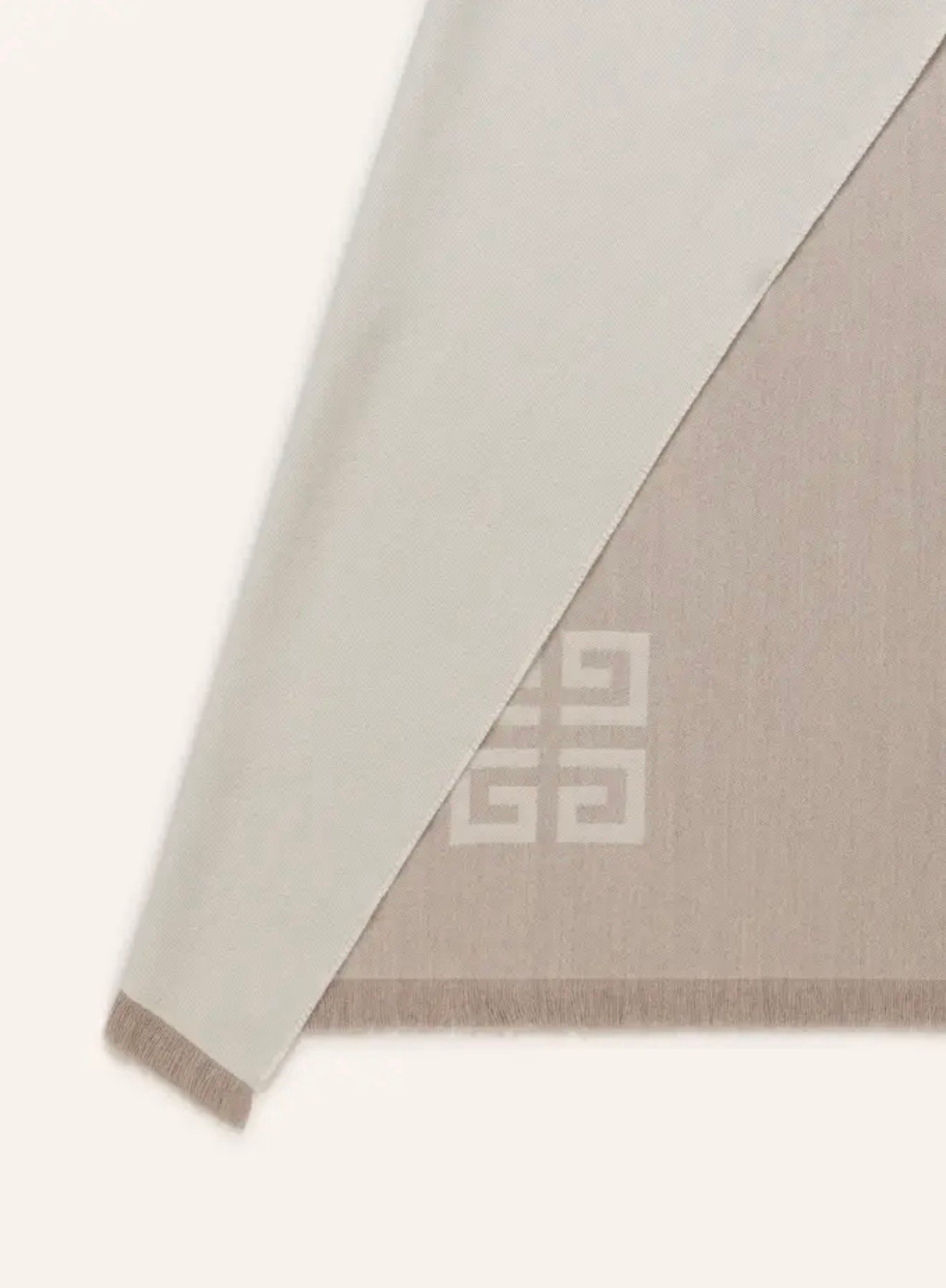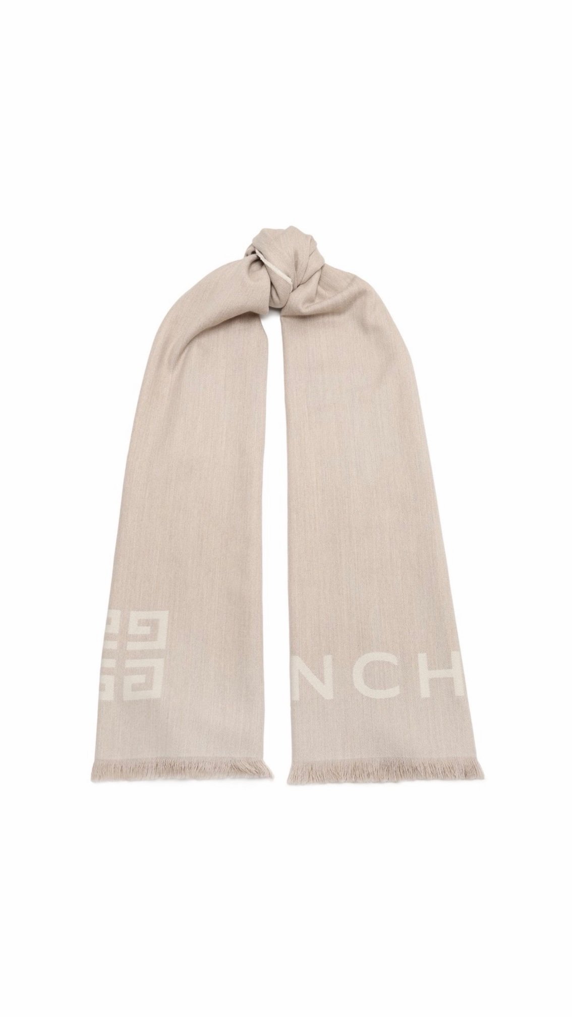 Шарф Givenchy — розкішний аксесуар з вовни та кашеміру (51% wool / 49% cashmere). Надзвичайно м’який, теплий і приємний до тіла, у універсальному світлому відтінку з впізнаваним логотипом бренду. Елегантне завершення зимових і міжсезонних образів.