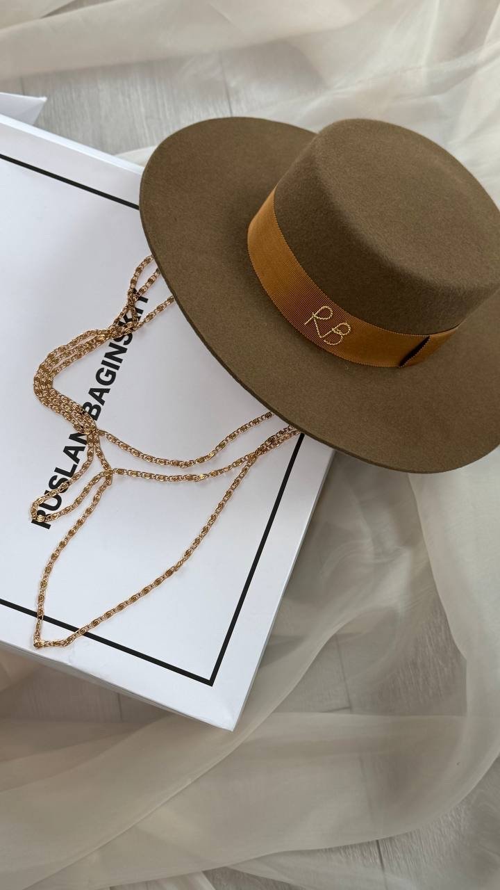 Капелюх коричневого кольору з широкими полями, оздоблений стрічкою з лого RB та знімним золотистим ланцюжком