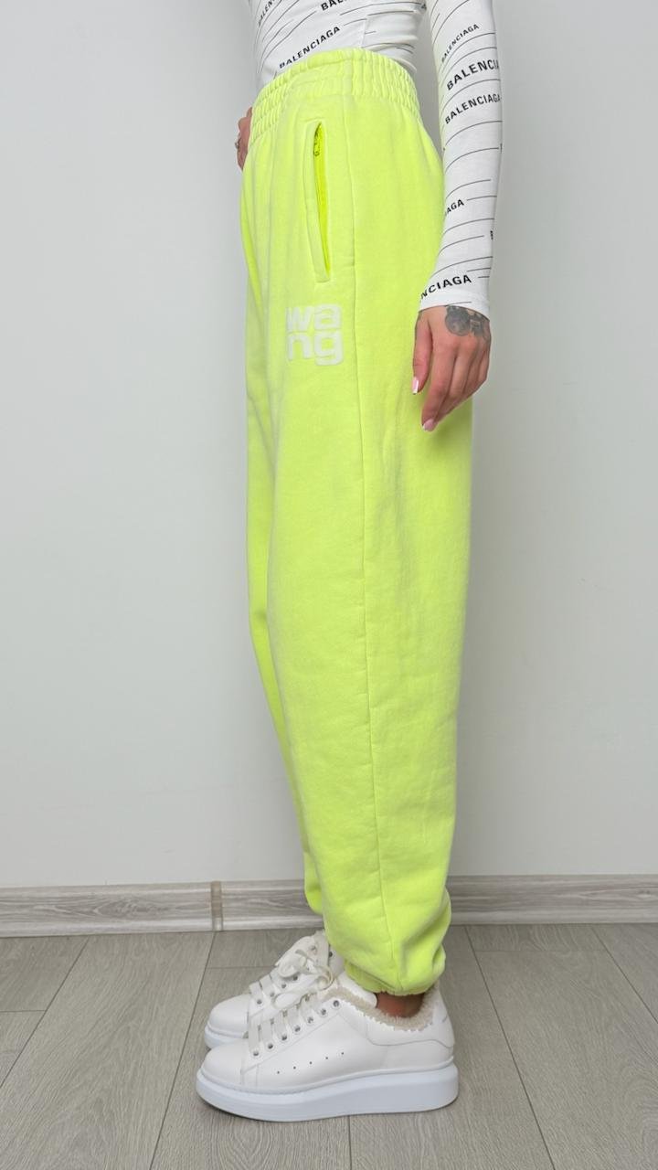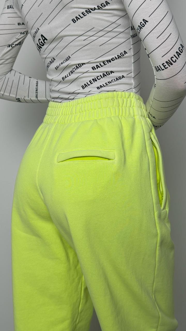Яскраво-салатові штани з білим логотипом бренду