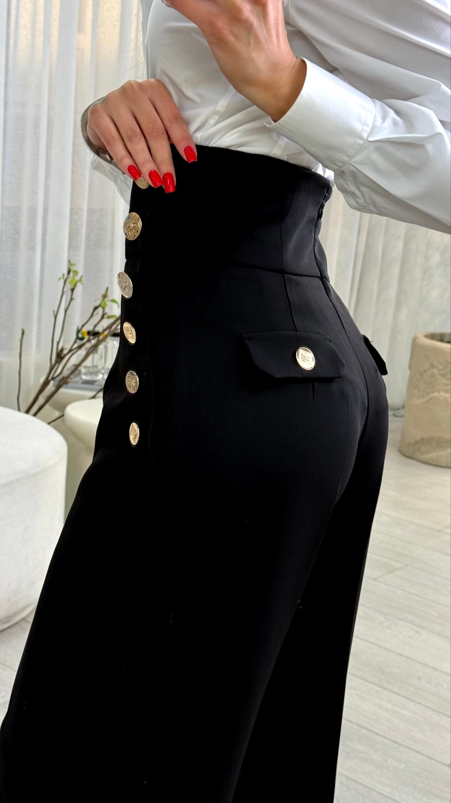 Втілення фірмового стилю Elisabetta Franchi: ці штани-палаццо поєднують у собі бездоганний крій та витончену розкіш. Висока посадка та пояс-корсет ідеально підкреслюють талію, створюючи неймовірно жіночний та сильний силует. Модель декорована подвійним рядом масивних золотистих ґудзиків з гравіюванням логотипу — візитівкою бренду, що додає нотку стилю мілітарі-шик. Ця модель — маст-хев для створення ефектного вечірнього образу або строгого, але спокусливого ділового луку.