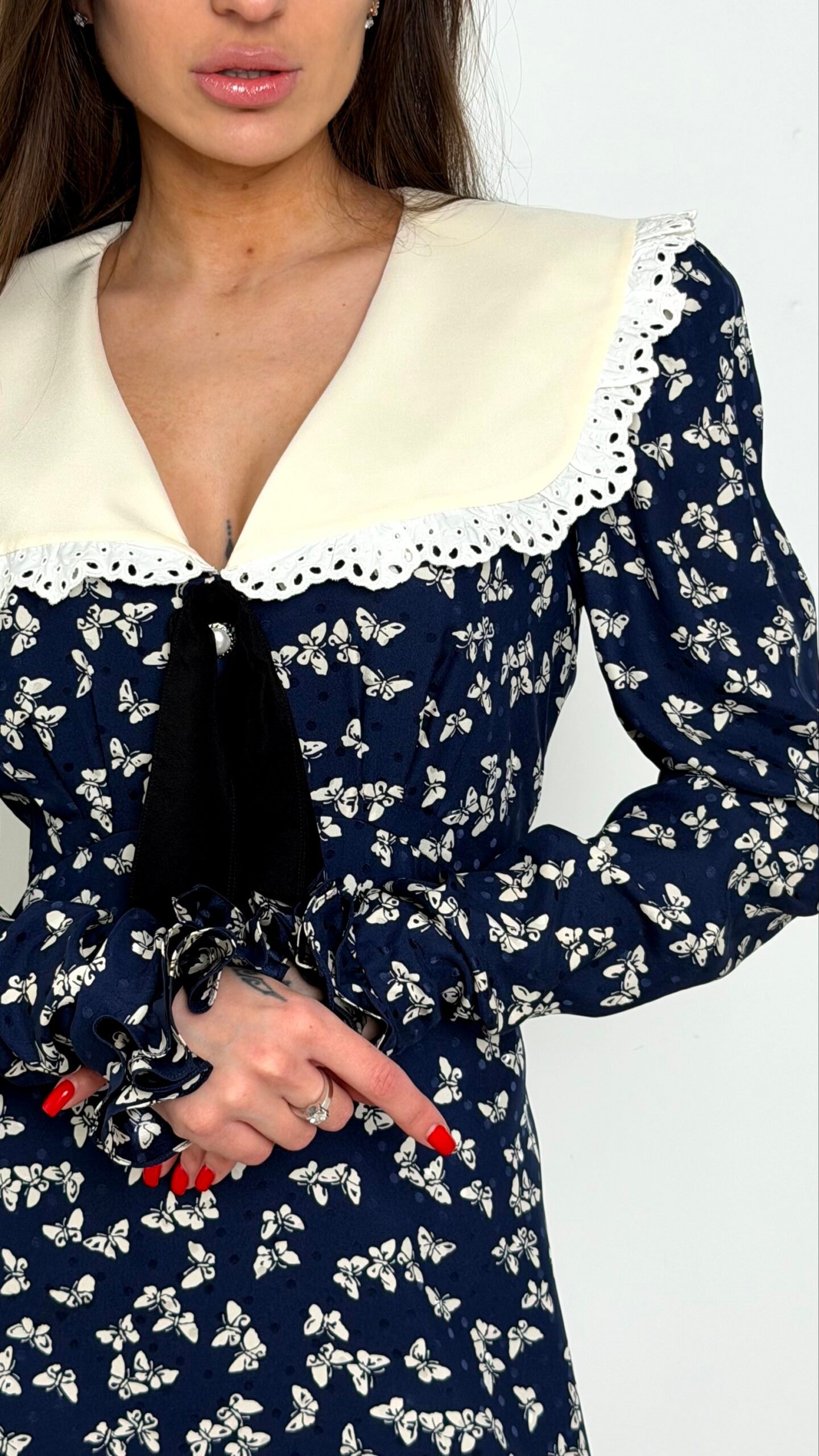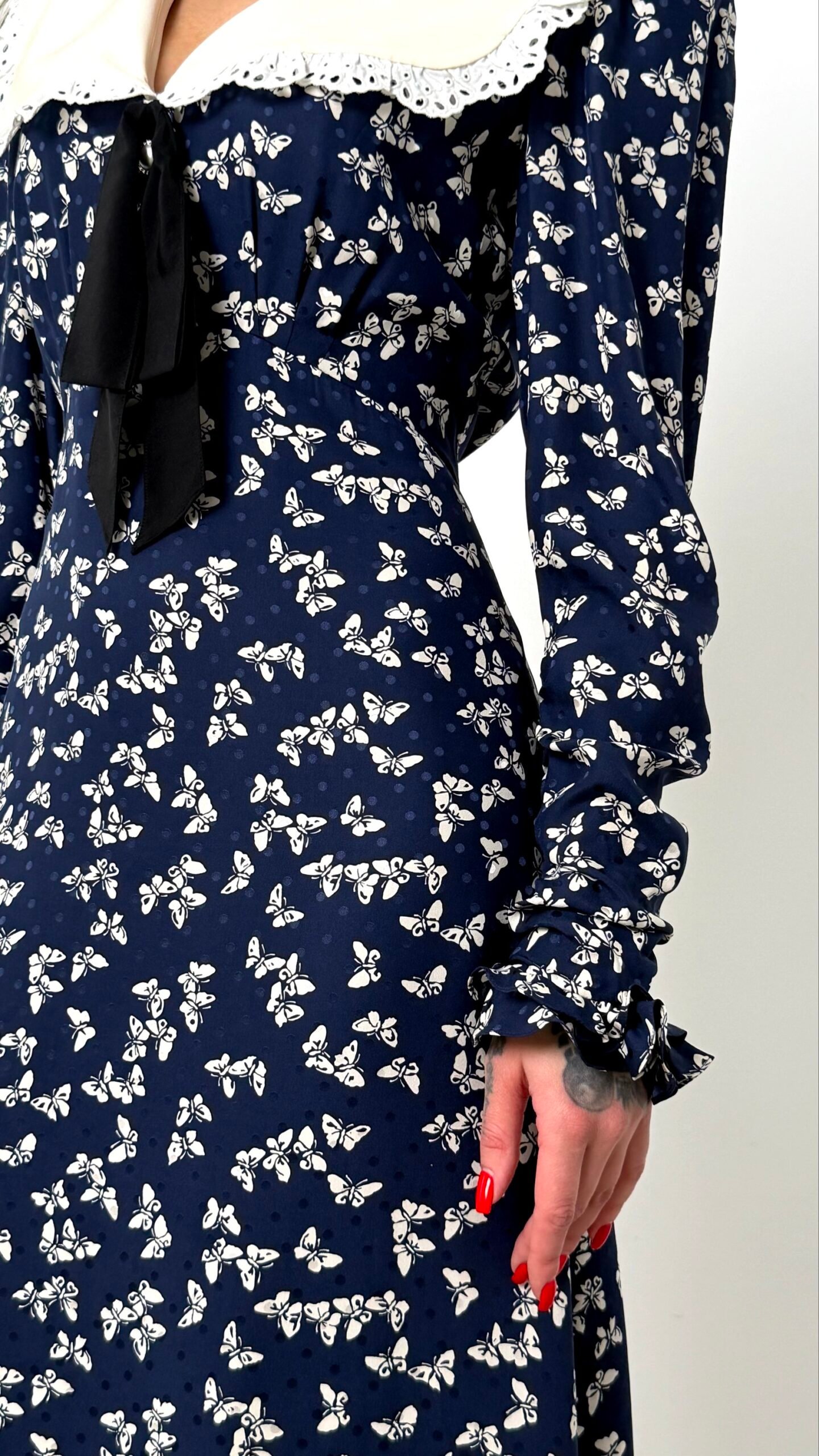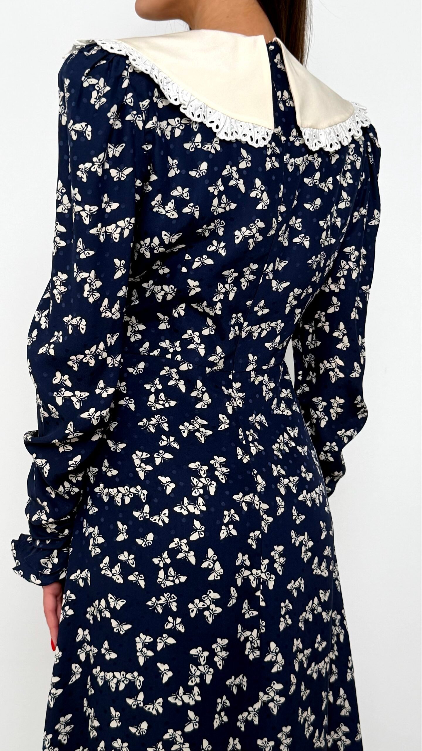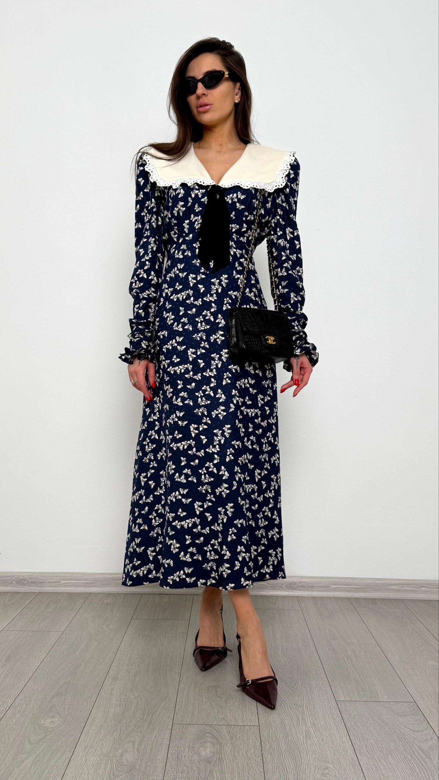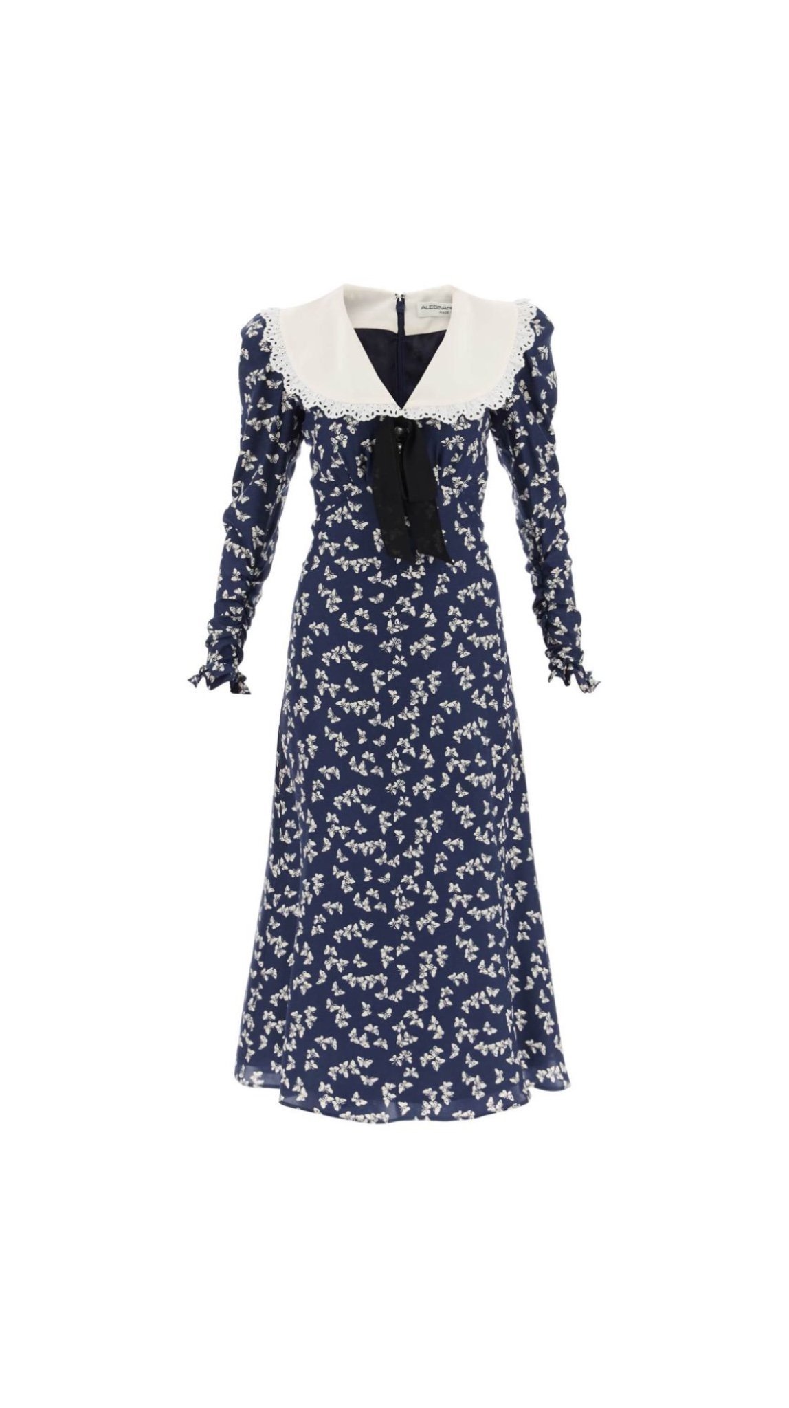 Витончена та жіночна сукня від італійського бренду Alessandra Rich — це втілення сучасної класики з вінтажним настроєм. Модель виконана з розкішного натурального шовку, що забезпечує неперевершену легкість та благородний вигляд.Широкий контрастний комір молочного кольору, оздоблений вишуканим мереживом, додає образу романтичності у стилі «ретро-шик». Приталений крій, що плавно переходить у вільну спідницю довжини міді, візуально витягує силует та підкреслює талію. Ця сукня ідеально поєднується як з класичними туфлями-човниками або слінгбеками, так і з лаконічними босоніжками.