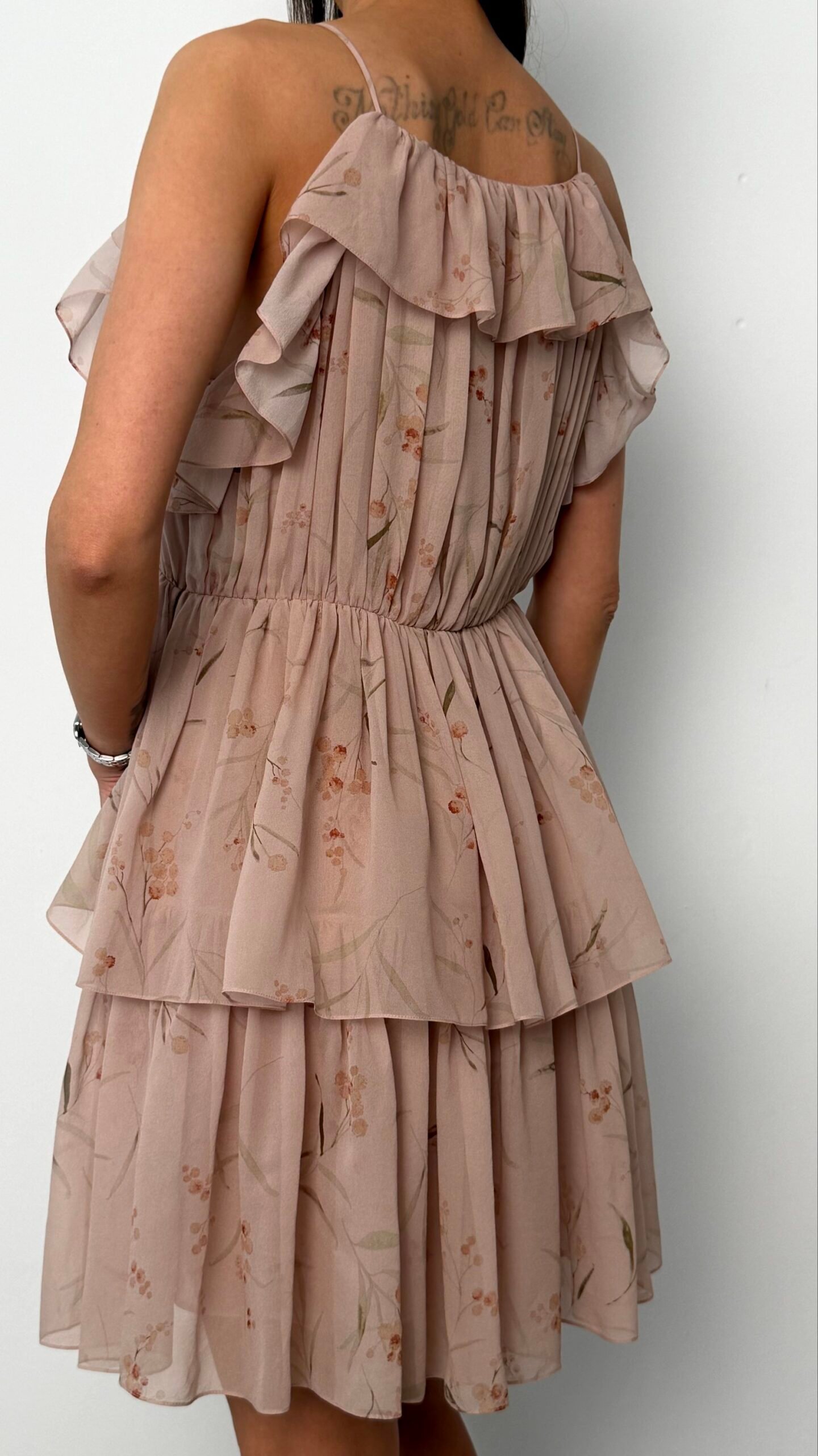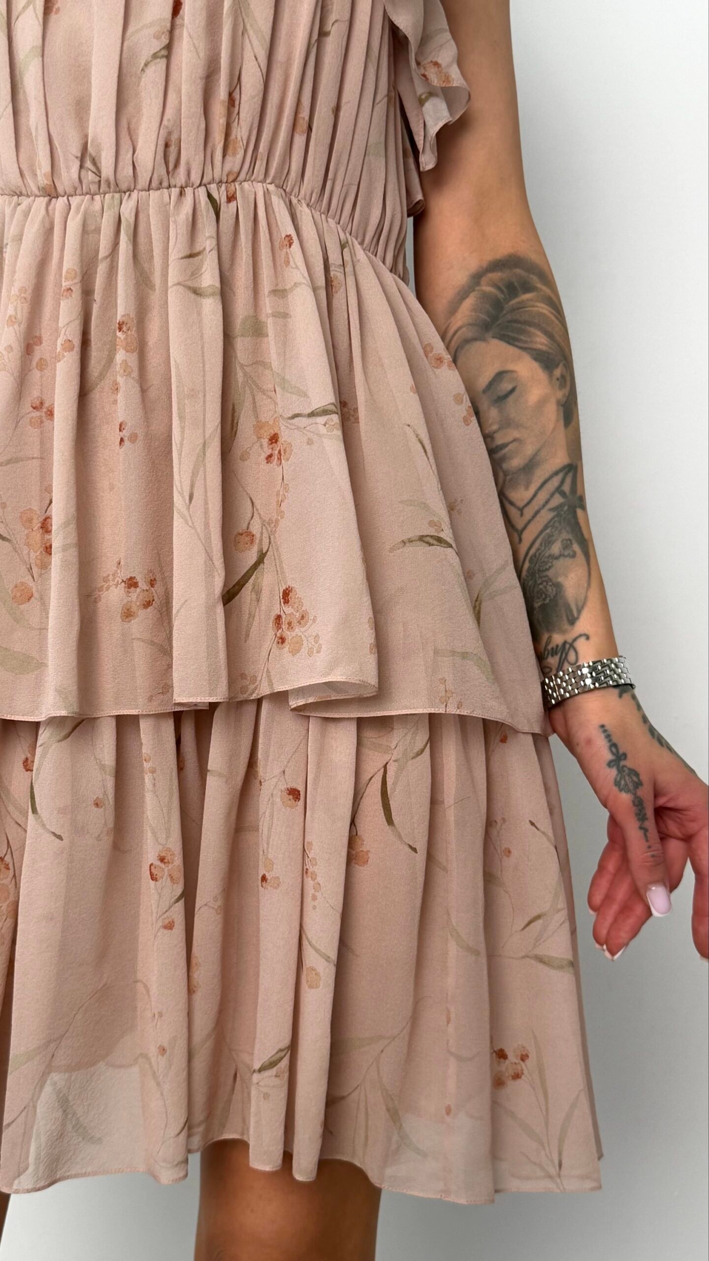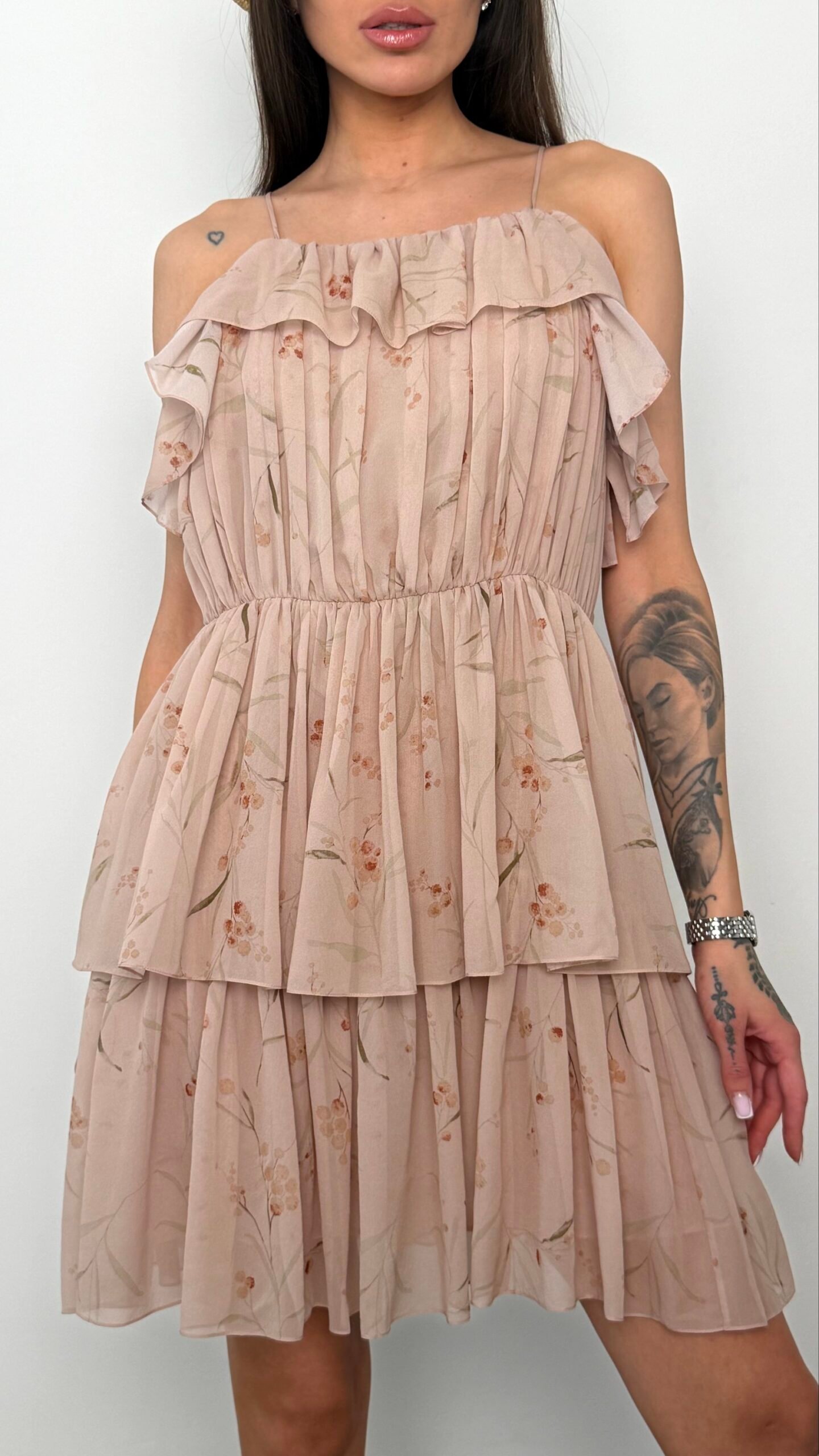 Ця витончена сукня створена для того, щоб дарувати відчуття легкості та романтичного настрою. Поєднання невагомого шифону, плісированої текстури та пастельного квіткового малюнка робить її ідеальним вибором для святкових подій, прогулянок або літніх вечорів.