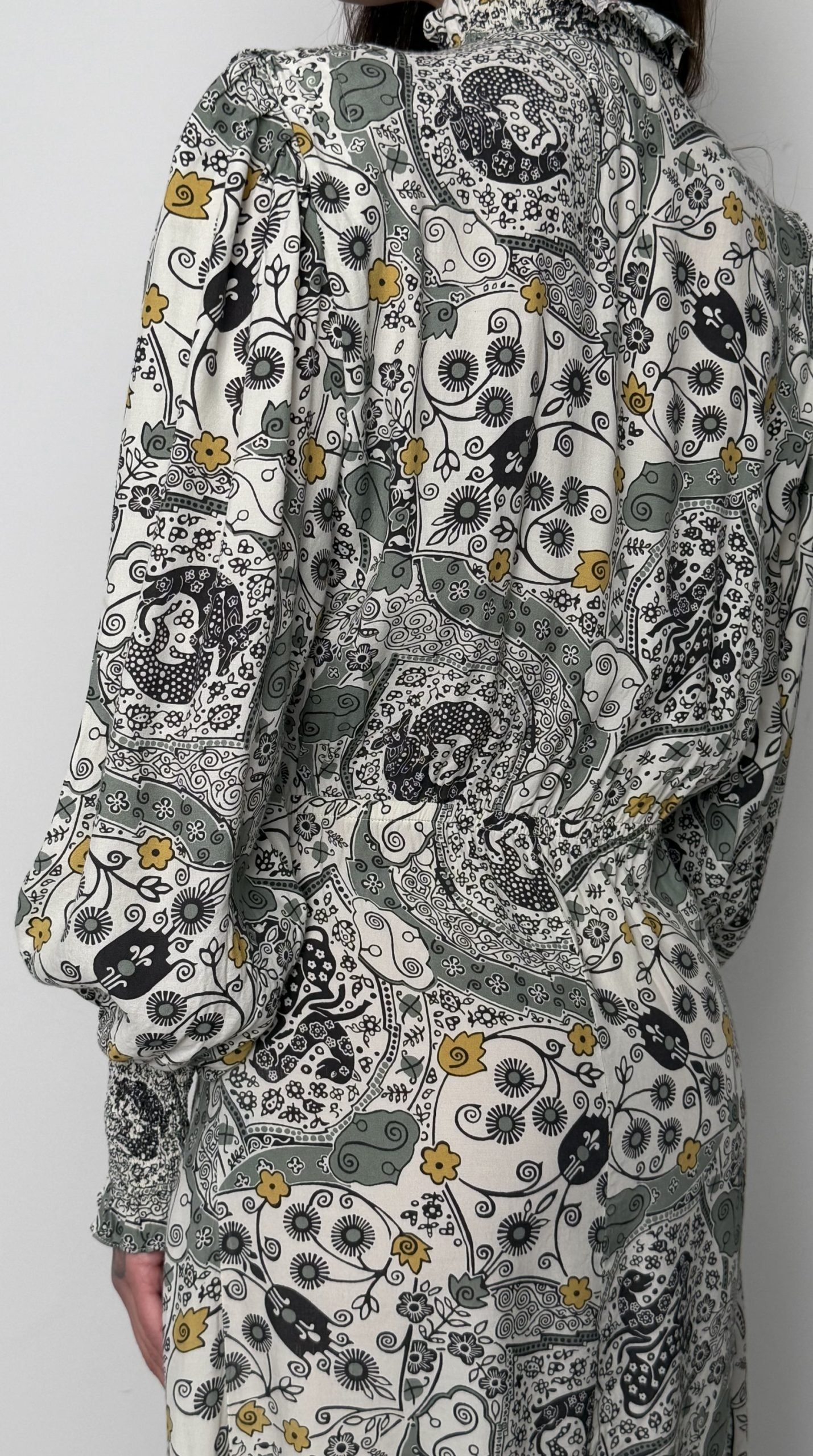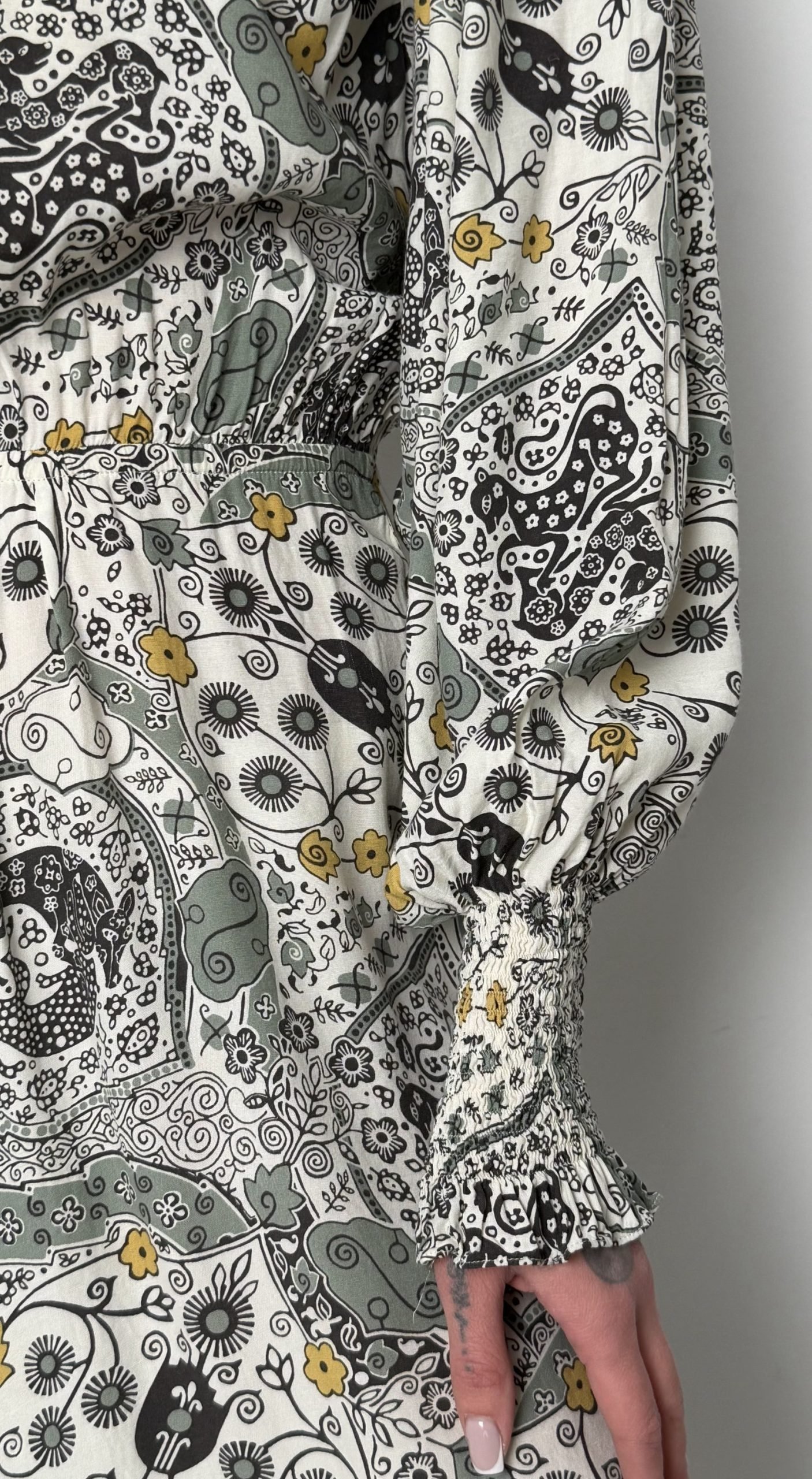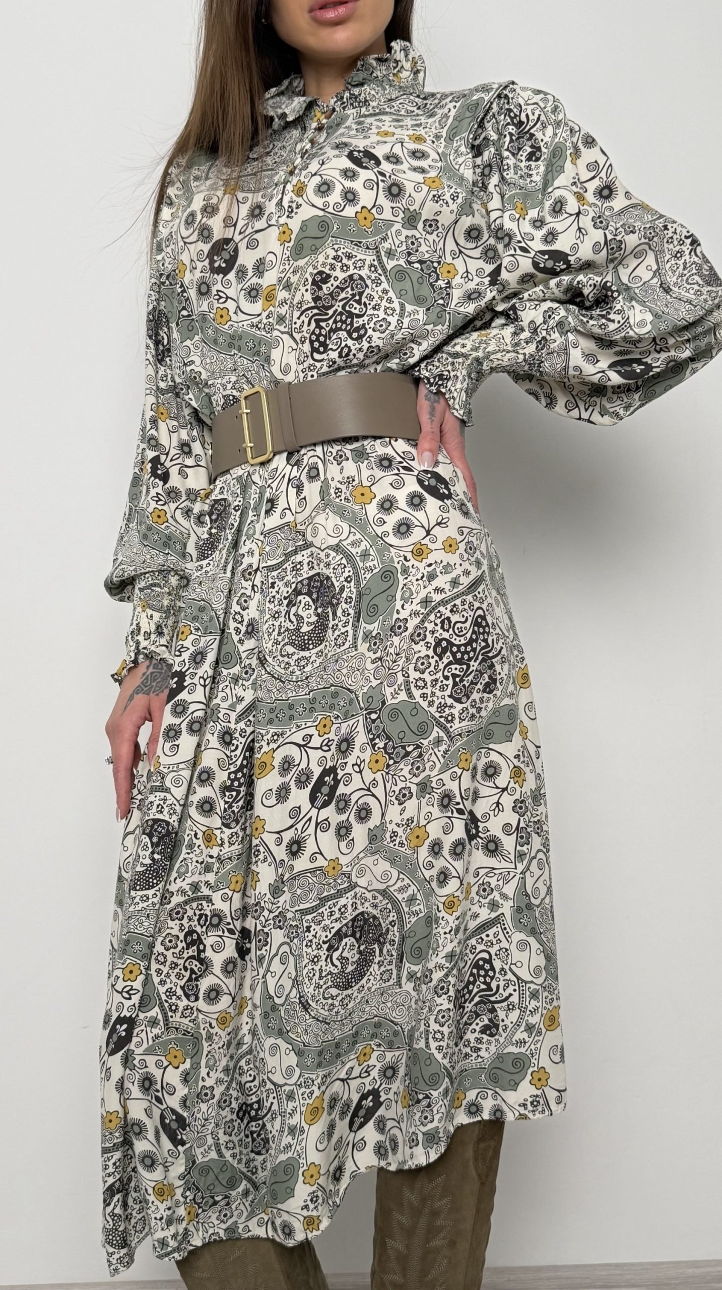 Елегантна сукня довжини міді, виконана у витонченому романтичному стилі. Модель поєднує класичний закритий верх із легким повітряним низом, що створює жіночний та збалансований силует.