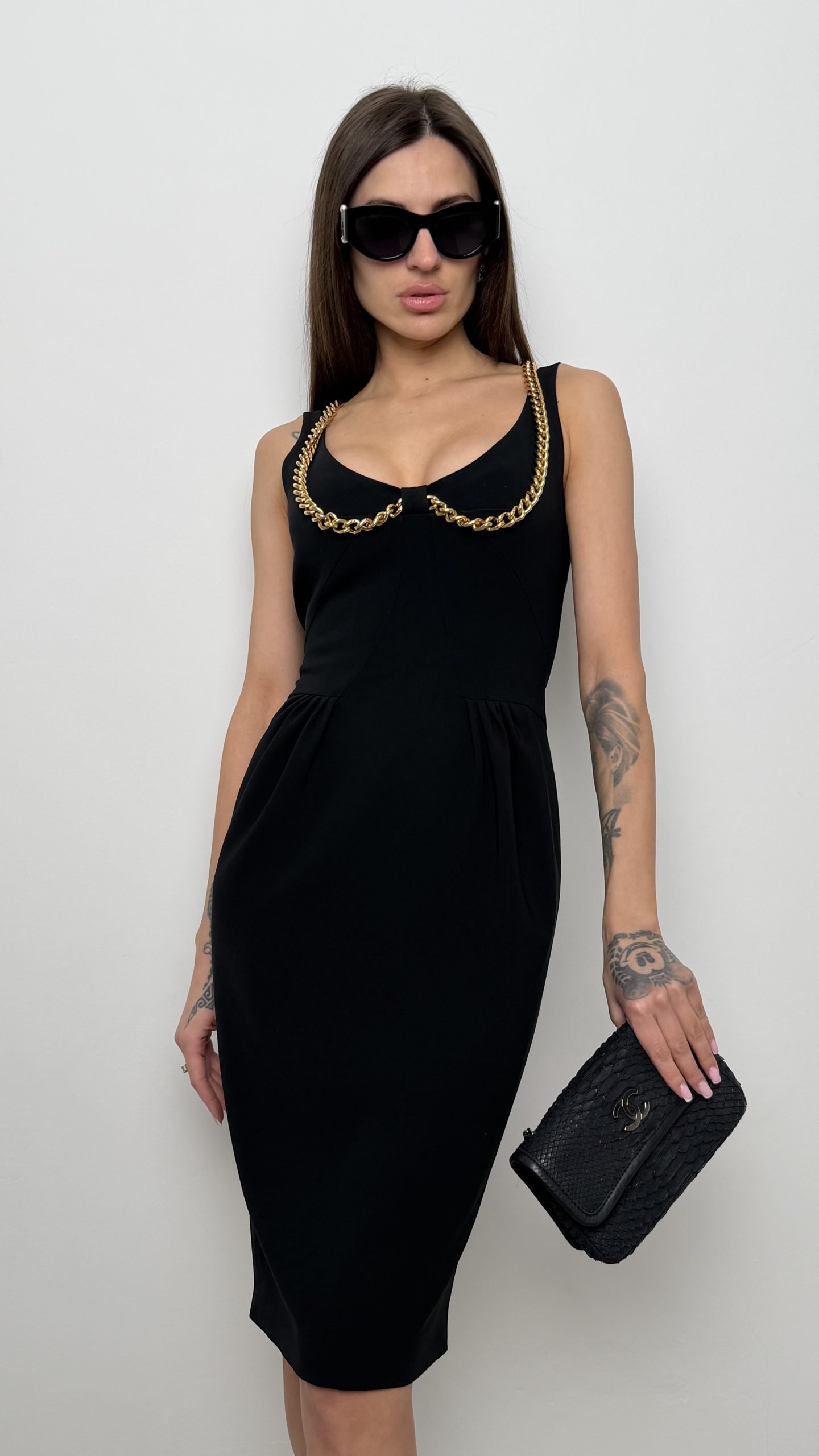 Чорна сукня у витонченому силуеті міді вирізняється акцентним декором у вигляді масивного золотого ланцюга вздовж лінії декольте — фірмовий, дуже ефектний хід, який підкреслює зонaу плечей та додає образу розкішного характеру. Модель виконана з щільної тканини, що ідеально тримає форму та підкреслює фігуру. Також сукню можна носити без ланцюжка- він знімається