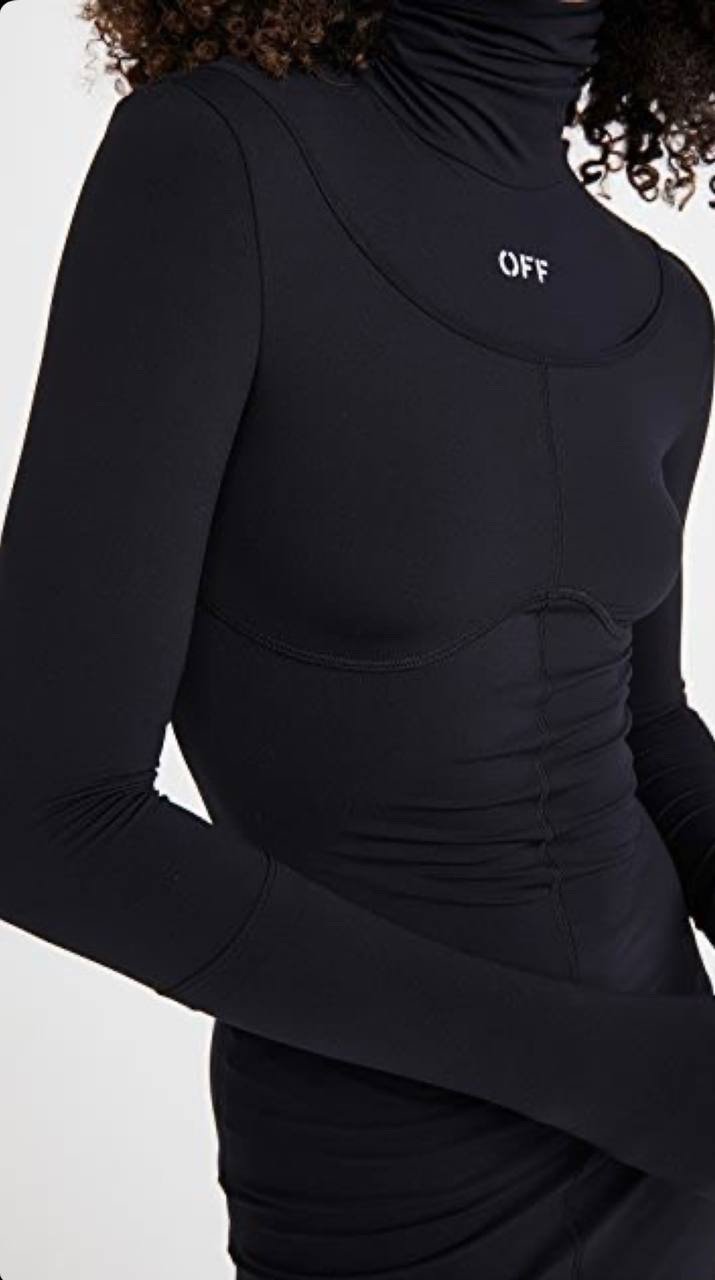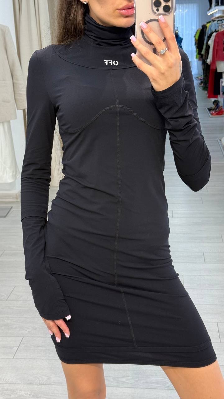 Чорна облягаюча сукня з високим горлом, довгими рукавами з прорізами та фірмовим логотипом OFF. Сукня доповнена контрасними швами, які підкреслюють силует