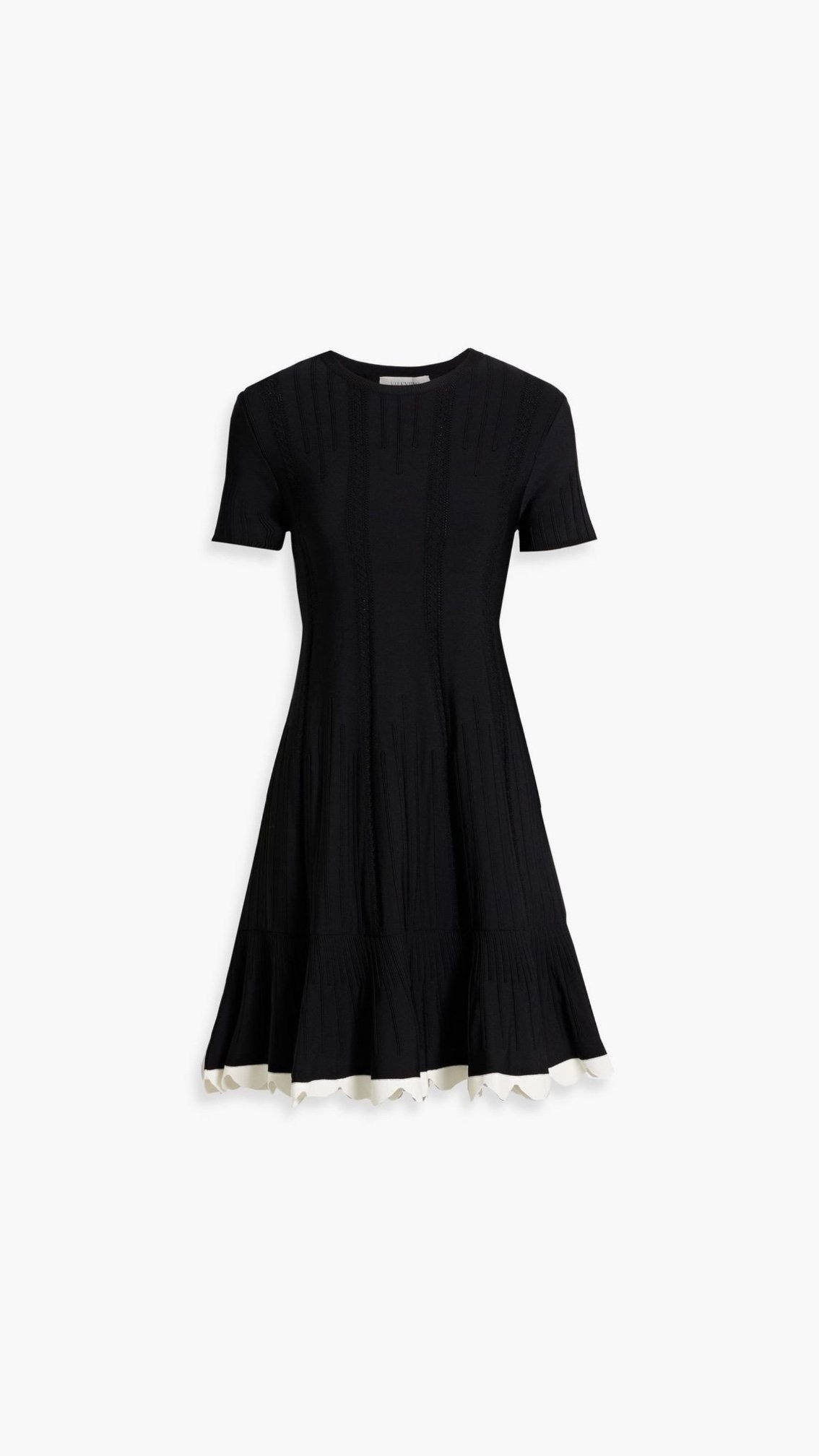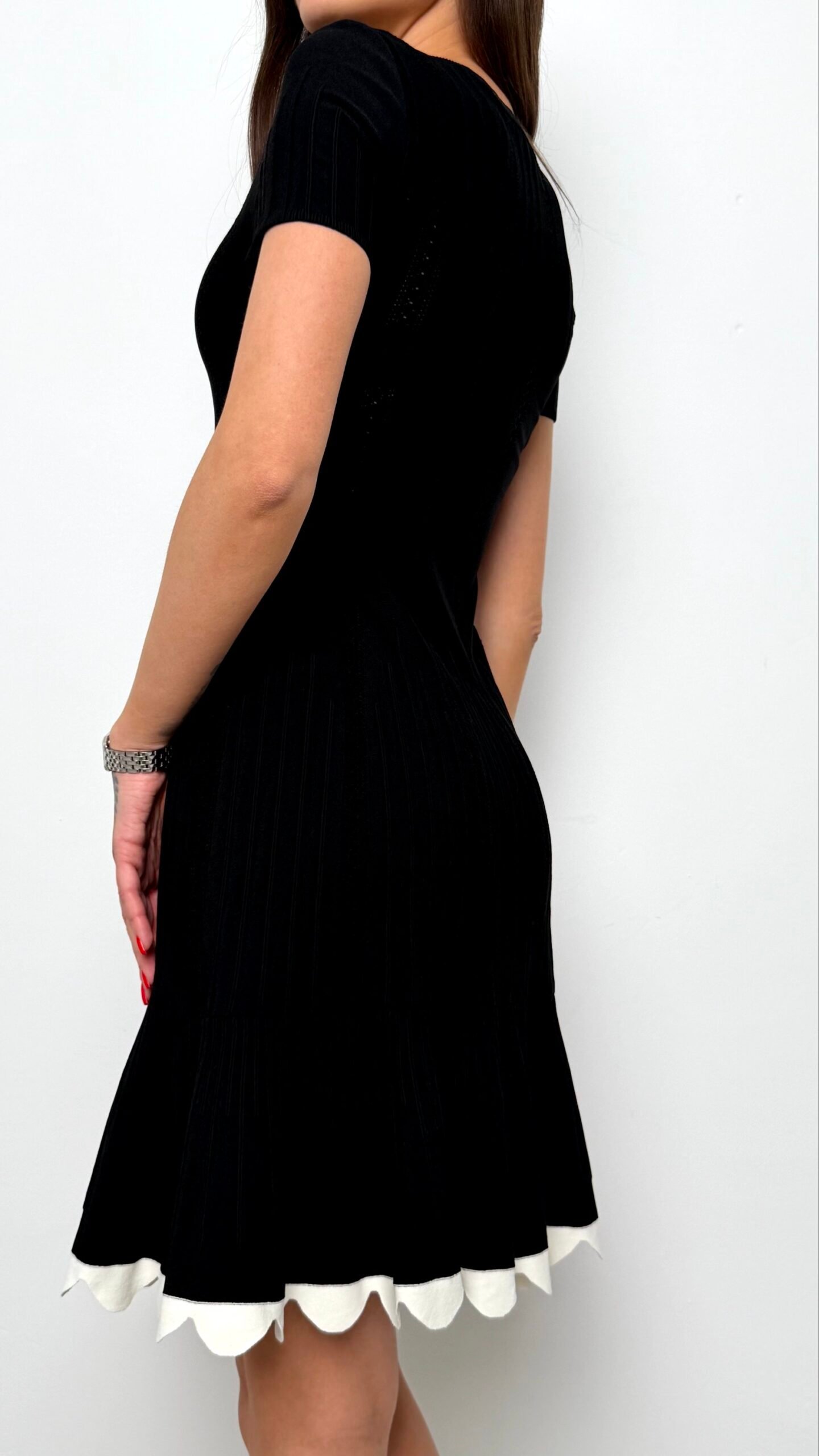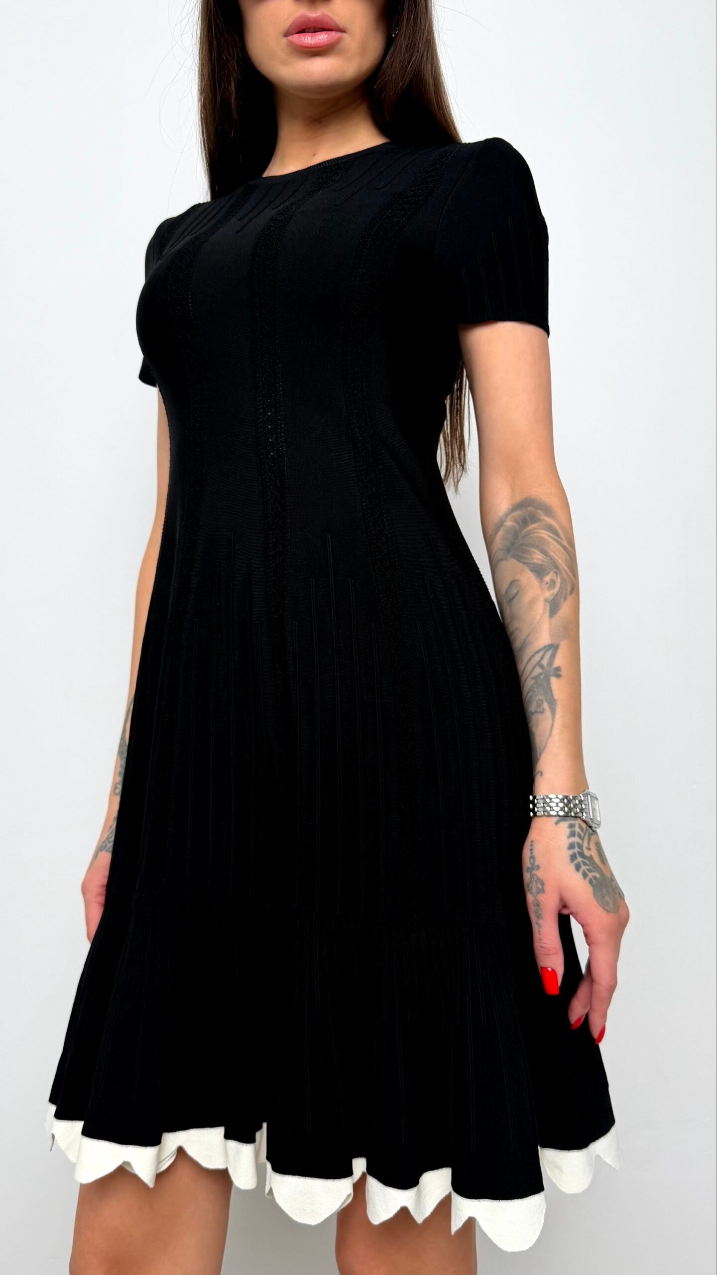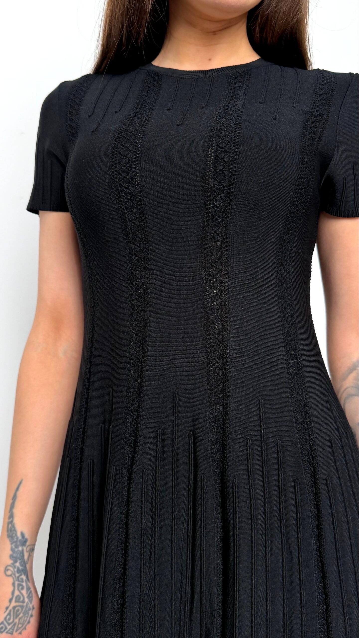 Ця витончена сукня поєднує в собі класичний силует та сучасні текстурні рішення. Завдяки приталеному крою, що плавно переходить у розкльошену спідницю (силует A-line), модель ідеально підкреслює фігуру, створюючи жіночний та легкий образ.