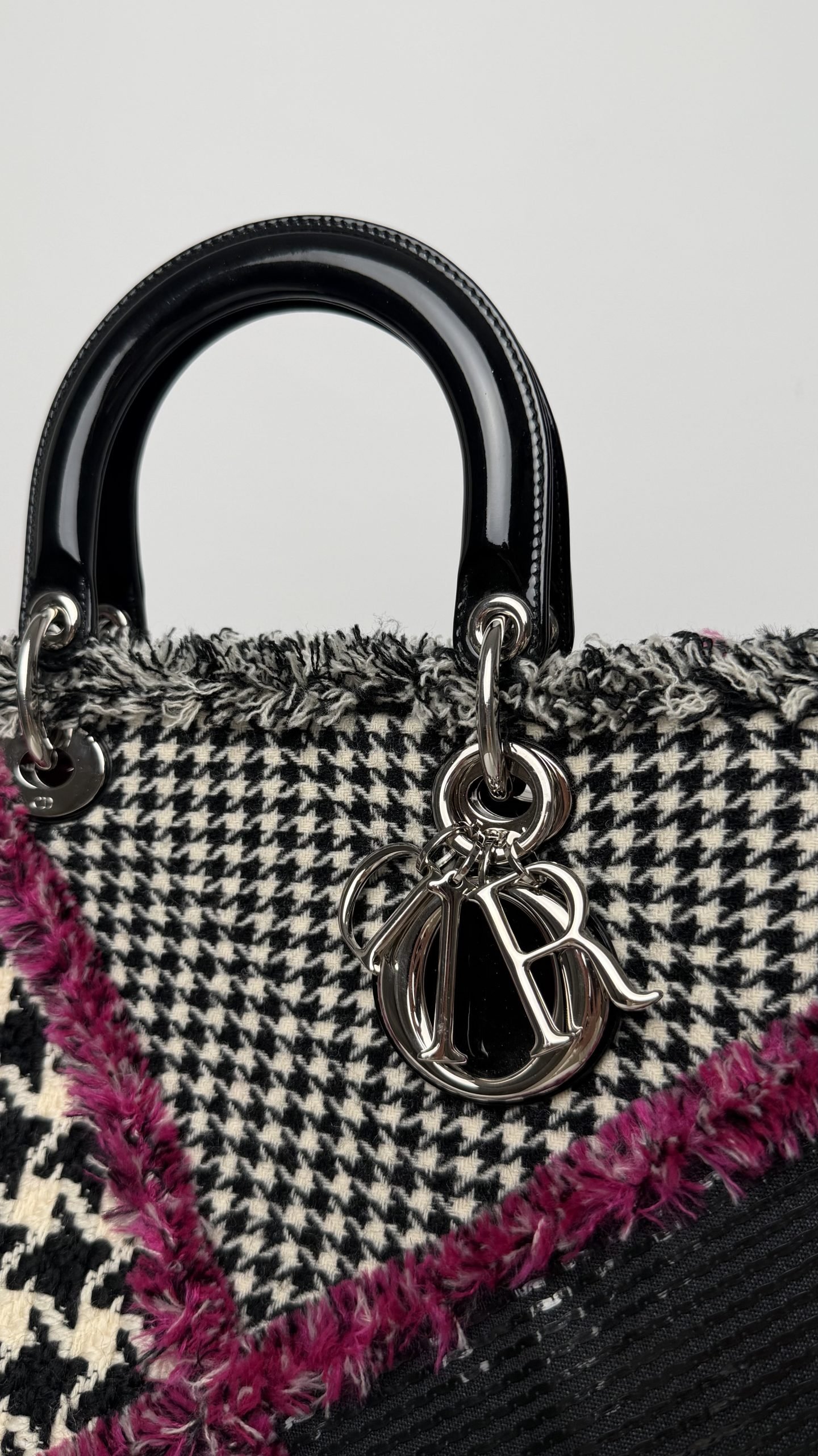 Легендарна сумка Lady Dior, виконана з фактурного текстилю з фірмовим візерунком бренду, — ікона стилю та символ витонченої французької елегантності. Модель привертає увагу контрастними вставками, які підкреслюють архітектурну форму сумки, та декоративною бахромою, що додає образу динаміки й модного характеру. Завершальним акцентом виступає культовий металевий підвіс із літерами DIOR, який підкреслює статусність і впізнаваність аксесуару