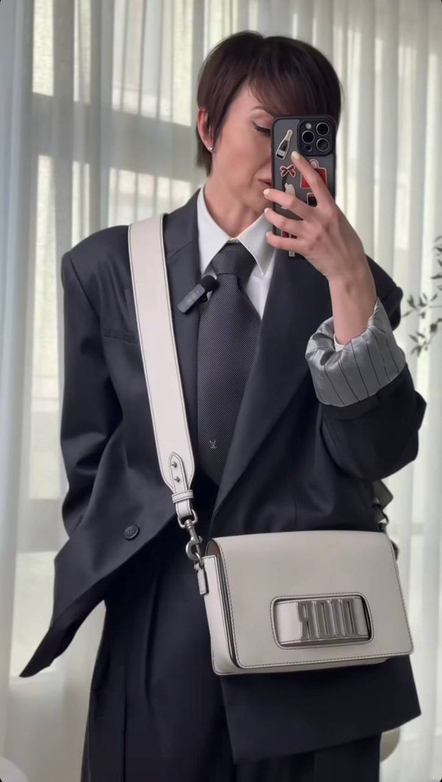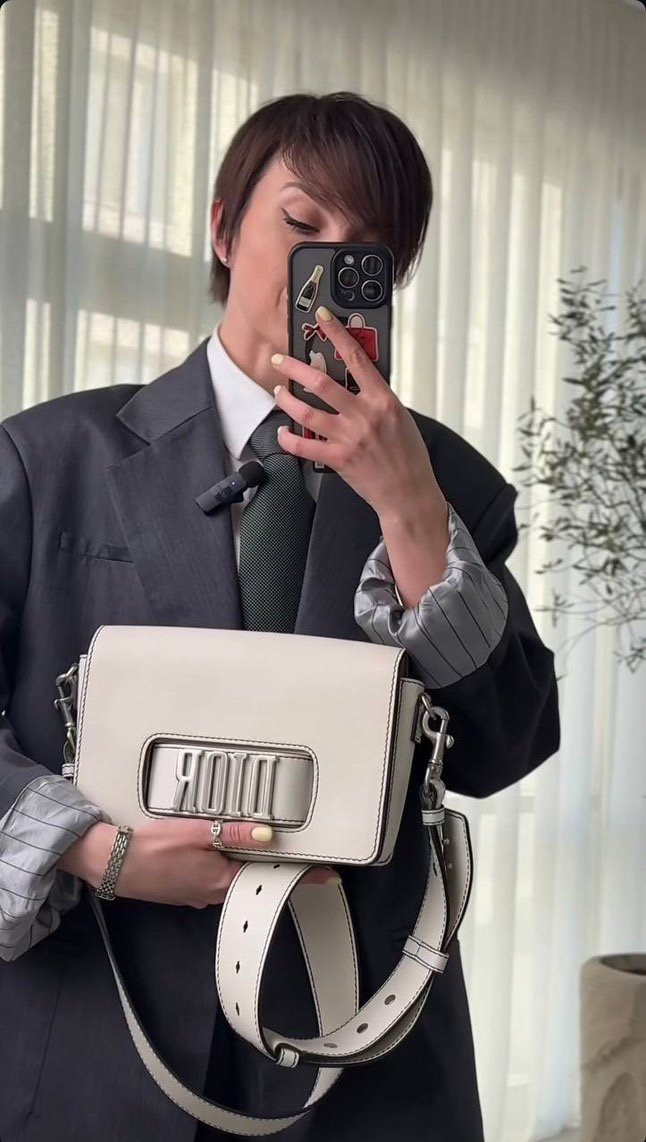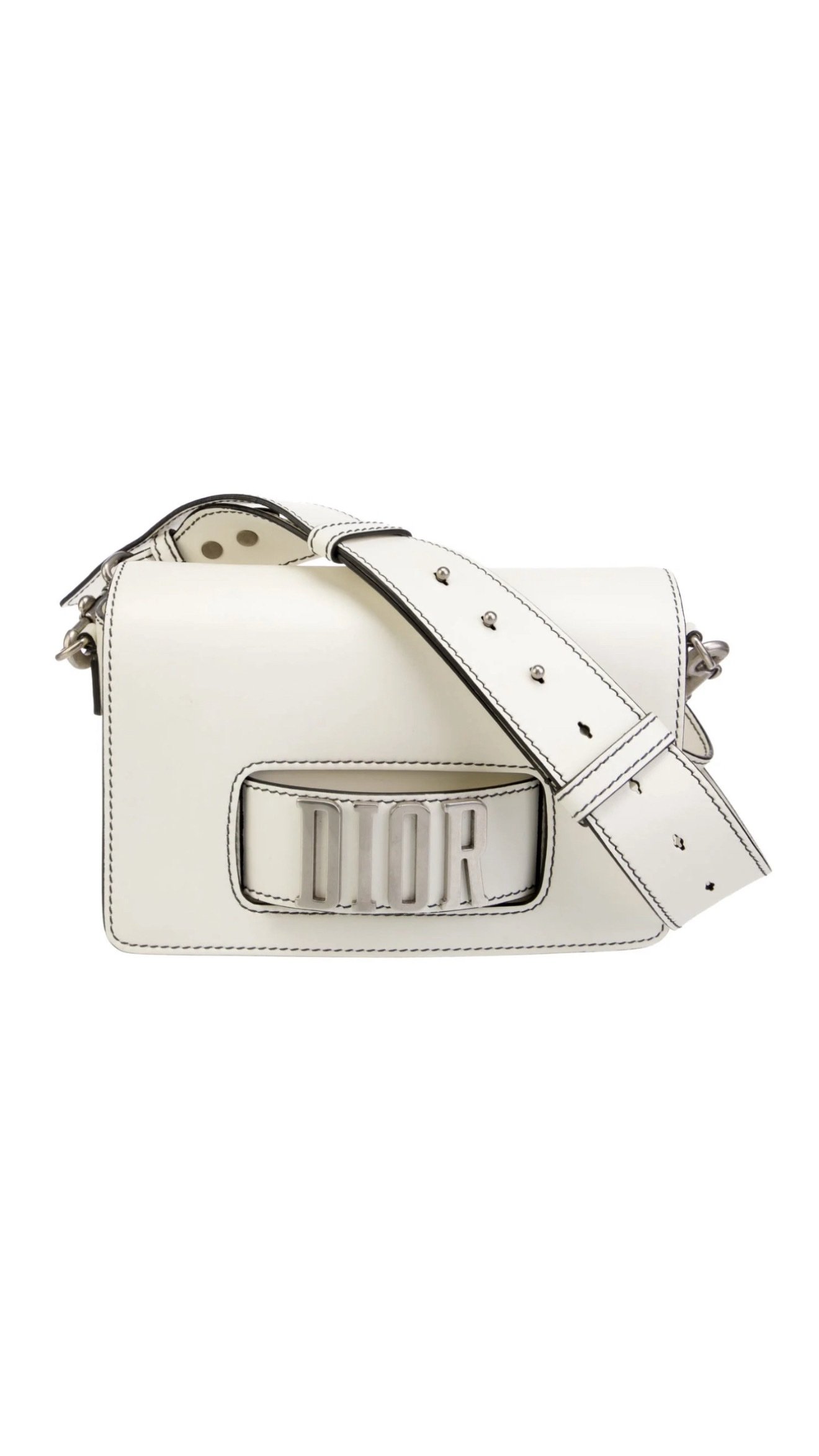 Сумка Dio( r) evolution у молочному відтінку — сучасний погляд на класичний силует. Виконана з гладкої телячої шкіри з контрастною чорною відстрочкою, вона вирізняється впізнаваним металевим логотипом “DIOR” у сріблястому відтінку на широкому ремені-застібці.