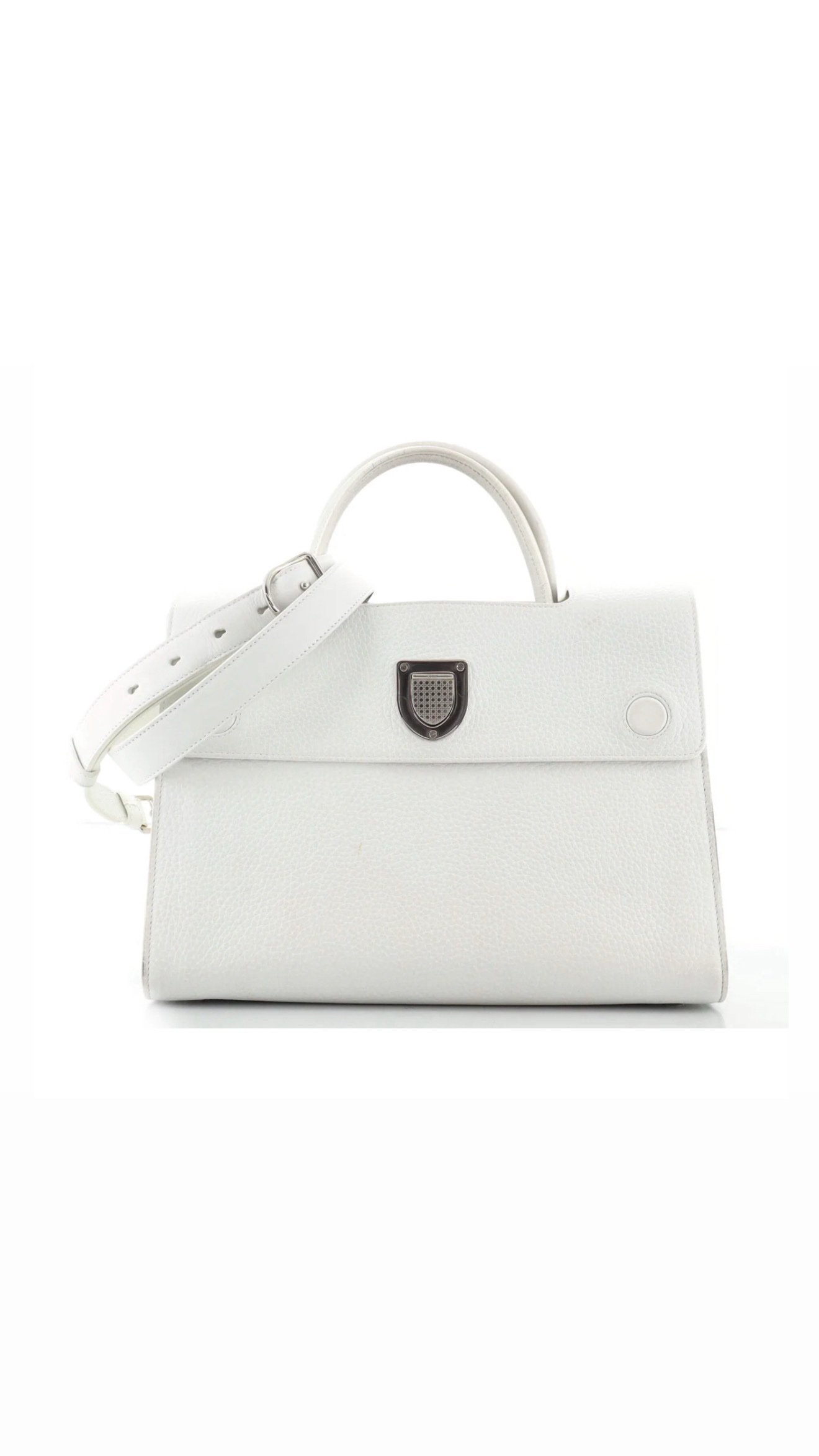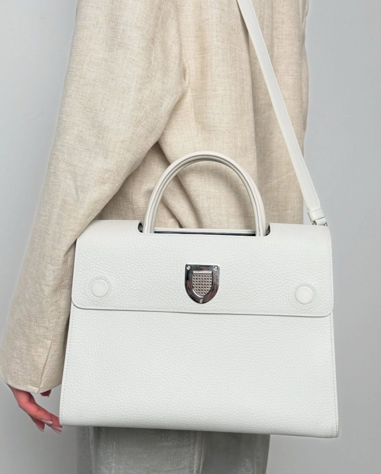 Сумка Diorever у білому кольорі — елегантна та універсальна модель, яка поєднує класичний силует і сучасний функціонал. Виконана з зернистої телячої шкіри, вона має структуровану форму та мінімалістичний дизайн, доповнений культовим металевим щитком Dior на клапані.