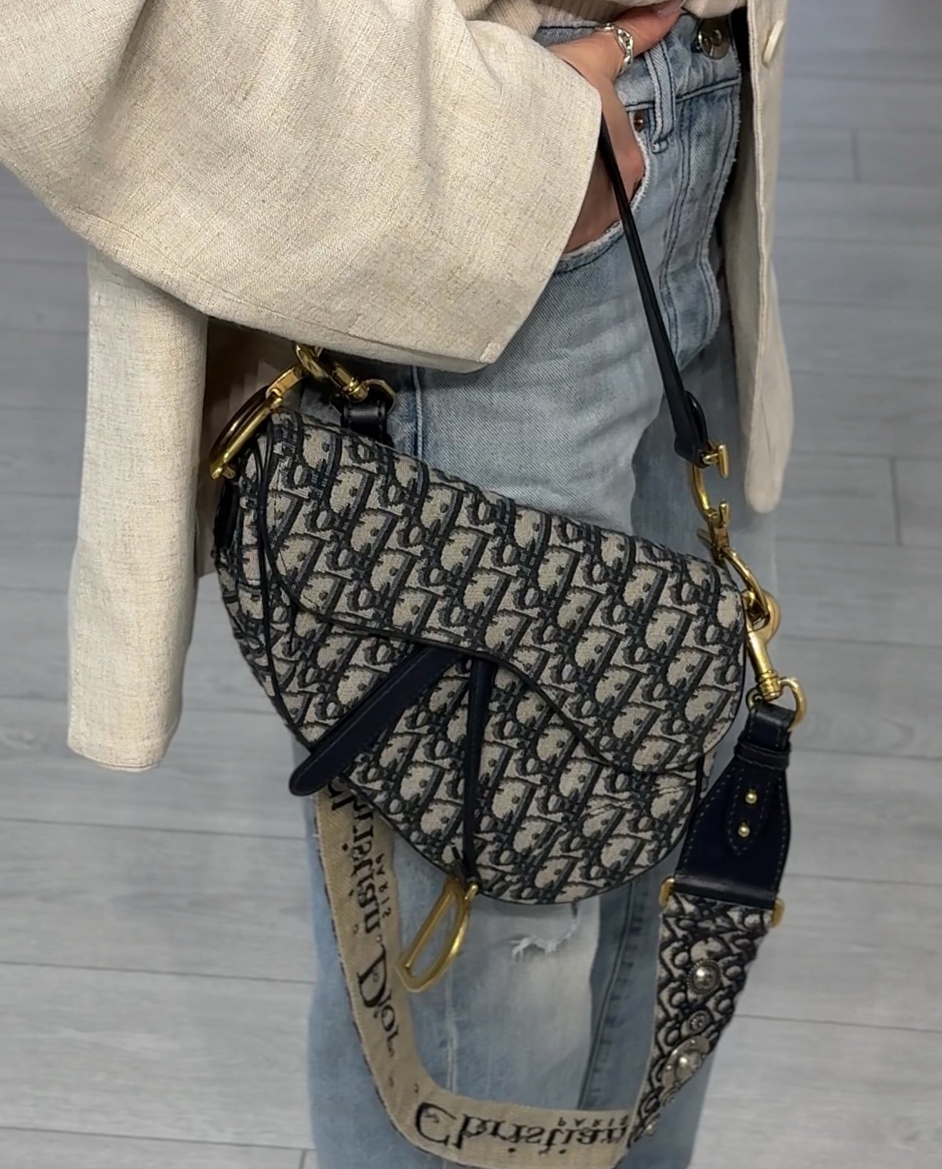 Сумка Dior Saddle у варіанті Oblique Jacquard — культова модель, що стала символом моди 2000-х та знову повернулася на подіуми. Виконана з фірмового жакардового полотна з монограмою Dior Oblique у синьо-бежевій гамі, доповнена вставками з гладкої шкіри та металевою фурнітурою у відтінку старого золота.