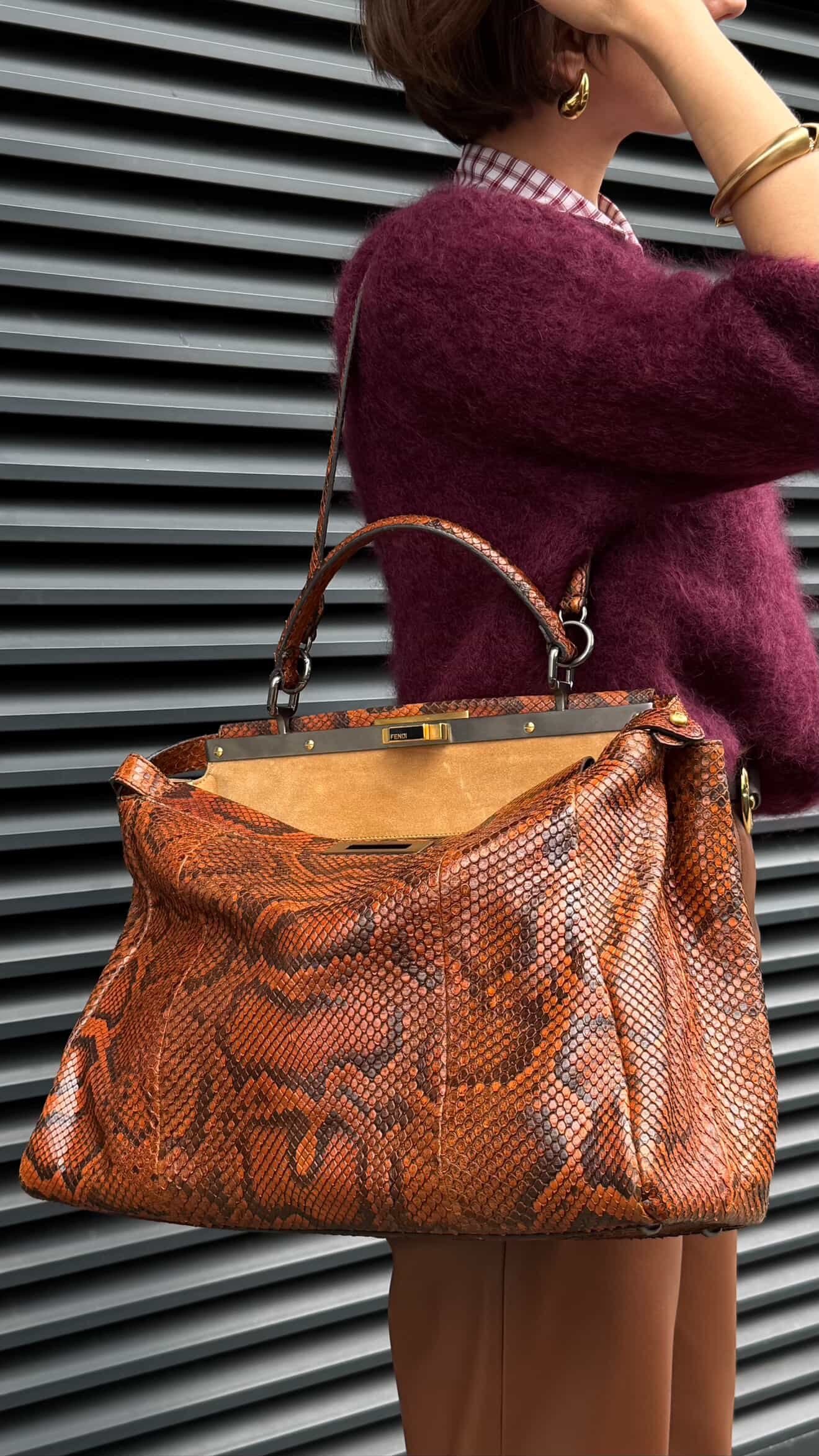 Розкішна сумка Fendi Peekaboo із натуральної шкіри пітона — справжній символ вишуканості та статусу. Модель виконана в теплих карамельно-коричневих тонах із виразною текстурою зміїного малюнка, що створює ефект глибини й блиску при кожному русі.