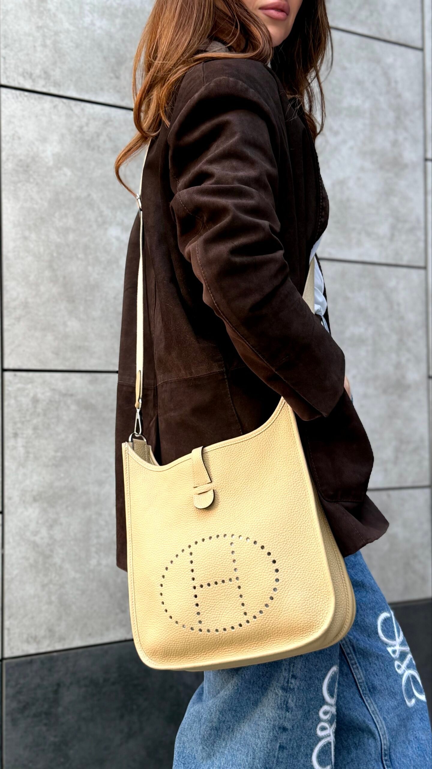 Ікона стилю Hermеs, що поєднує в собі функціональність та елегантну невимушеність. Модель Evelyne у 29-му розмірі (PM) — це ідеальний формат для активного міського життя, що вміщує всі необхідні речі та залишає руки вільними.М’яка шкіра Clemence з часом стає лише кращою, а зручний текстильний ремінь робить її незамінною для повсякденних образів — від джинсів до класичних пальт.