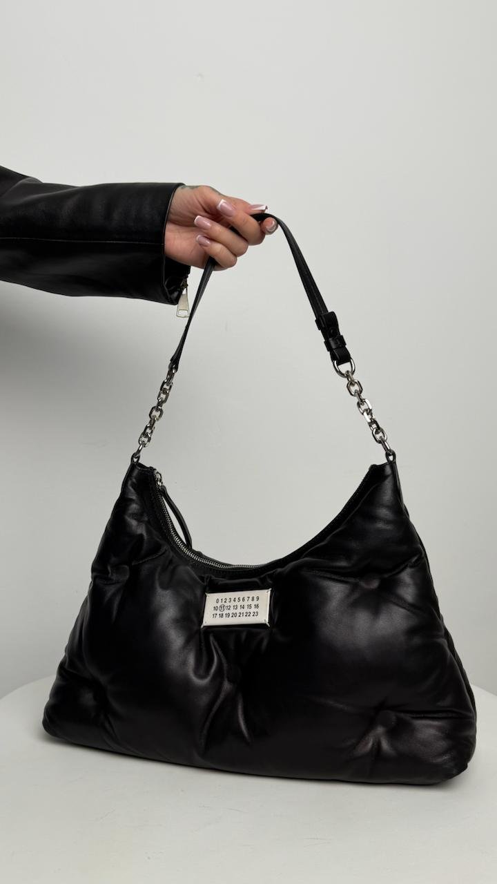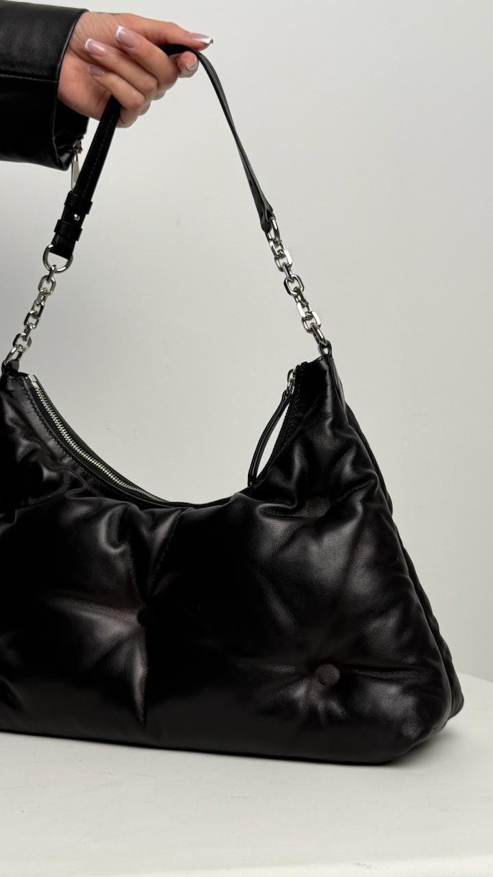 Іконична сумка Maison Margiela у чорному кольорі з ніжної шкіри— м’яка, об’ємна, стильна. З фірмовою табличкою марки. Носиться і на плечі, і в руці. Дуже містка та ультрамодна