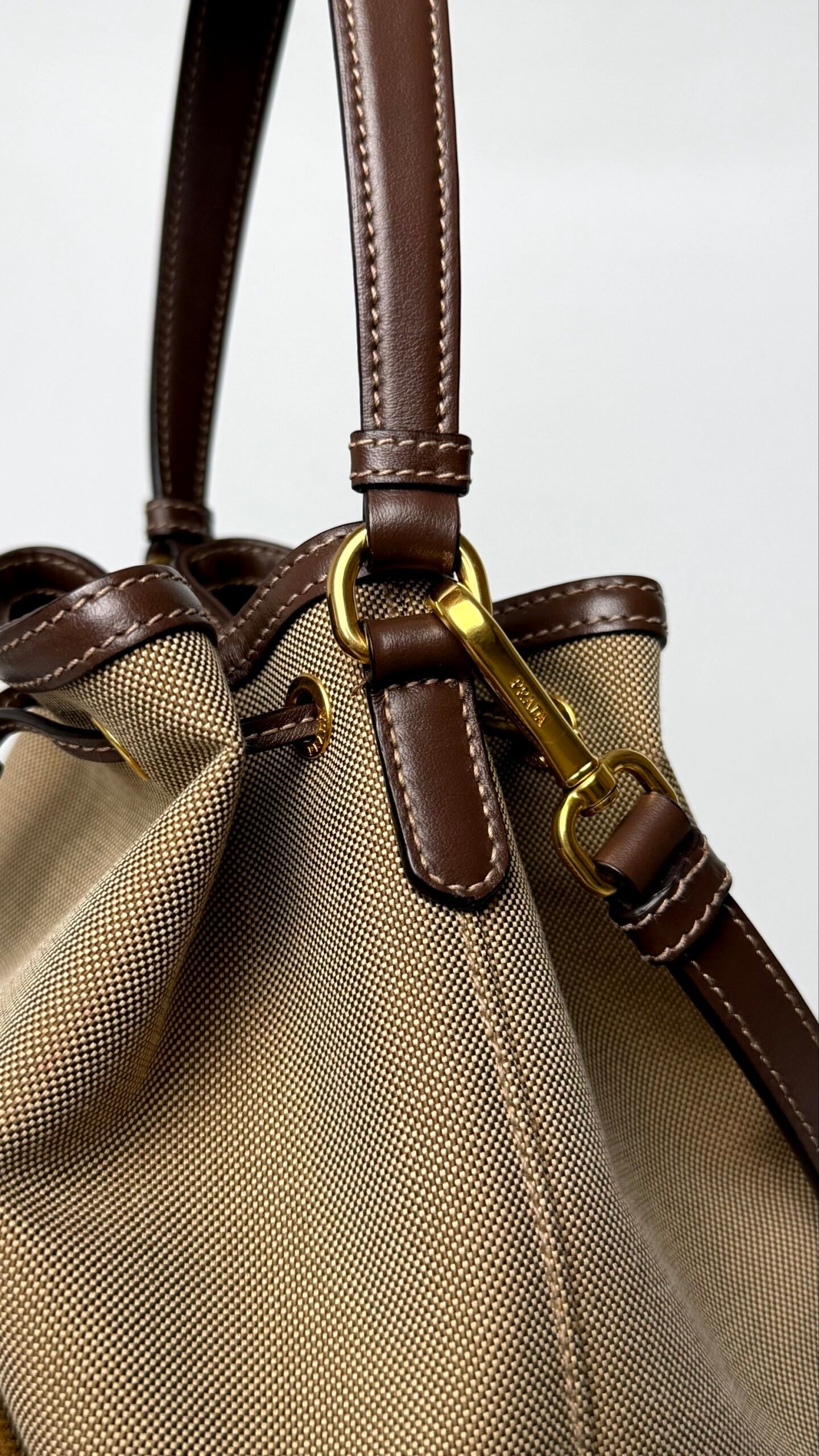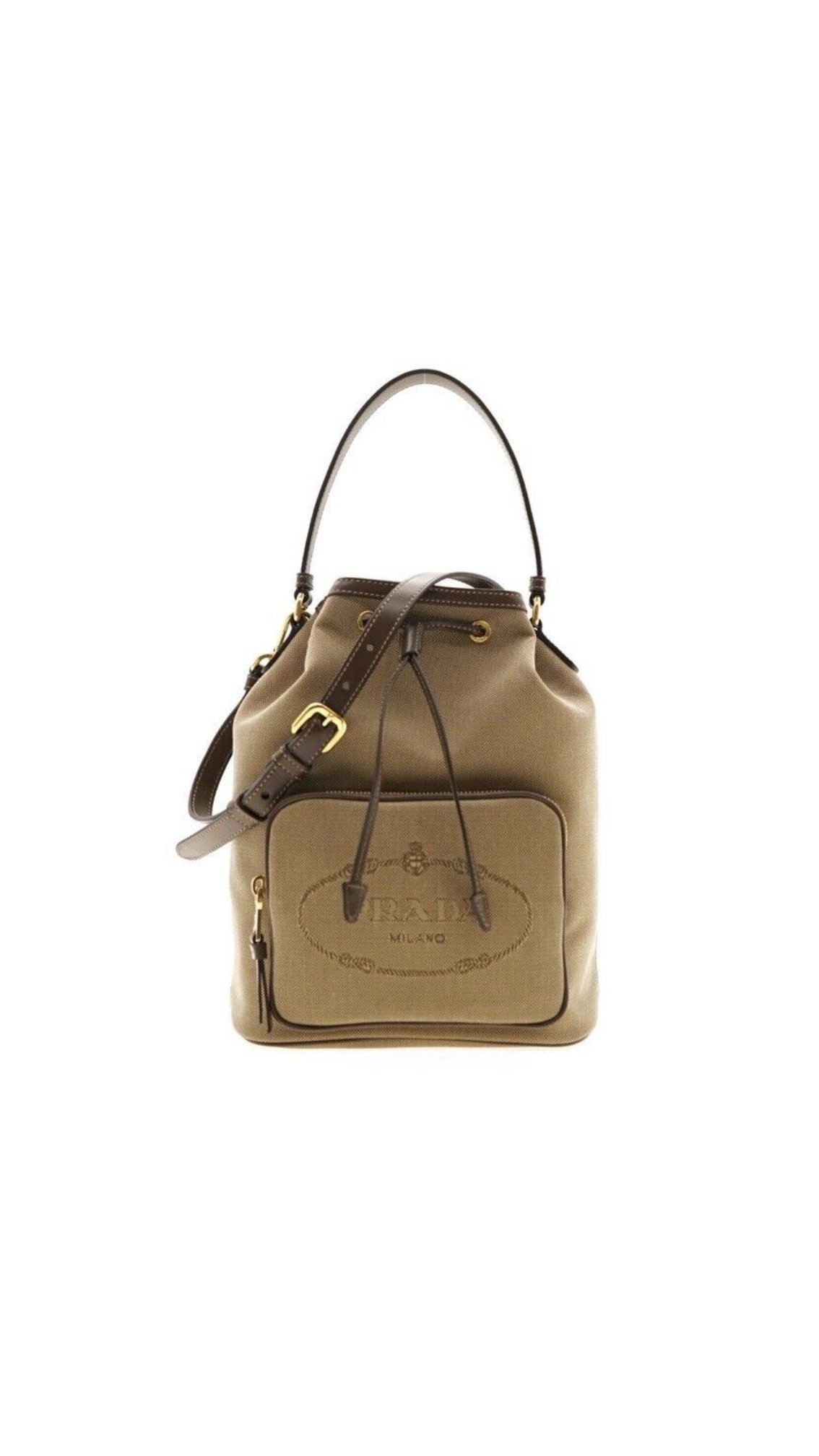 Елегантна та функціональна сумка від легендарного італійського дому Prada. Модель виконана в натуральній кольоровій гамі: поєднання пісочної канви та насичених коричневих елементів із натуральної шкіри створює стриманий, але дорогий образ у стилі «тихої розкоші».