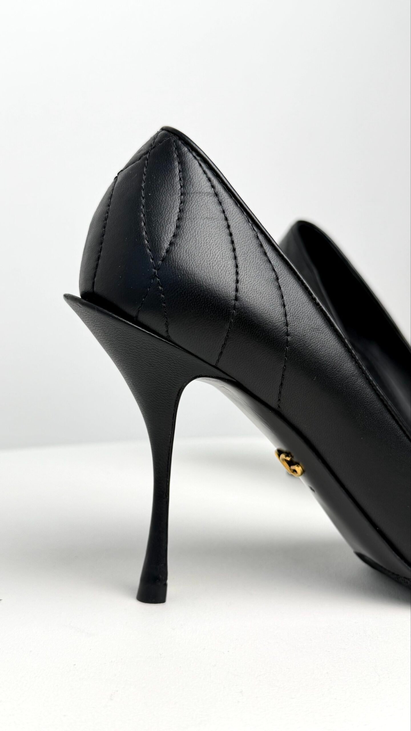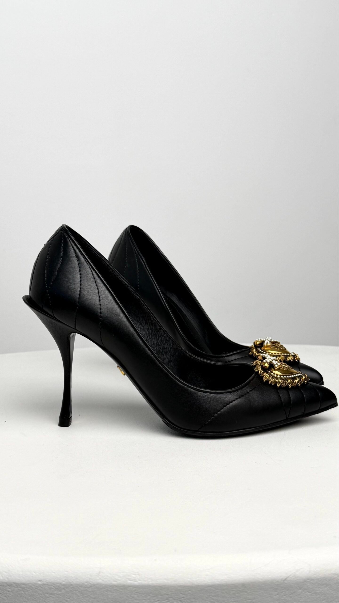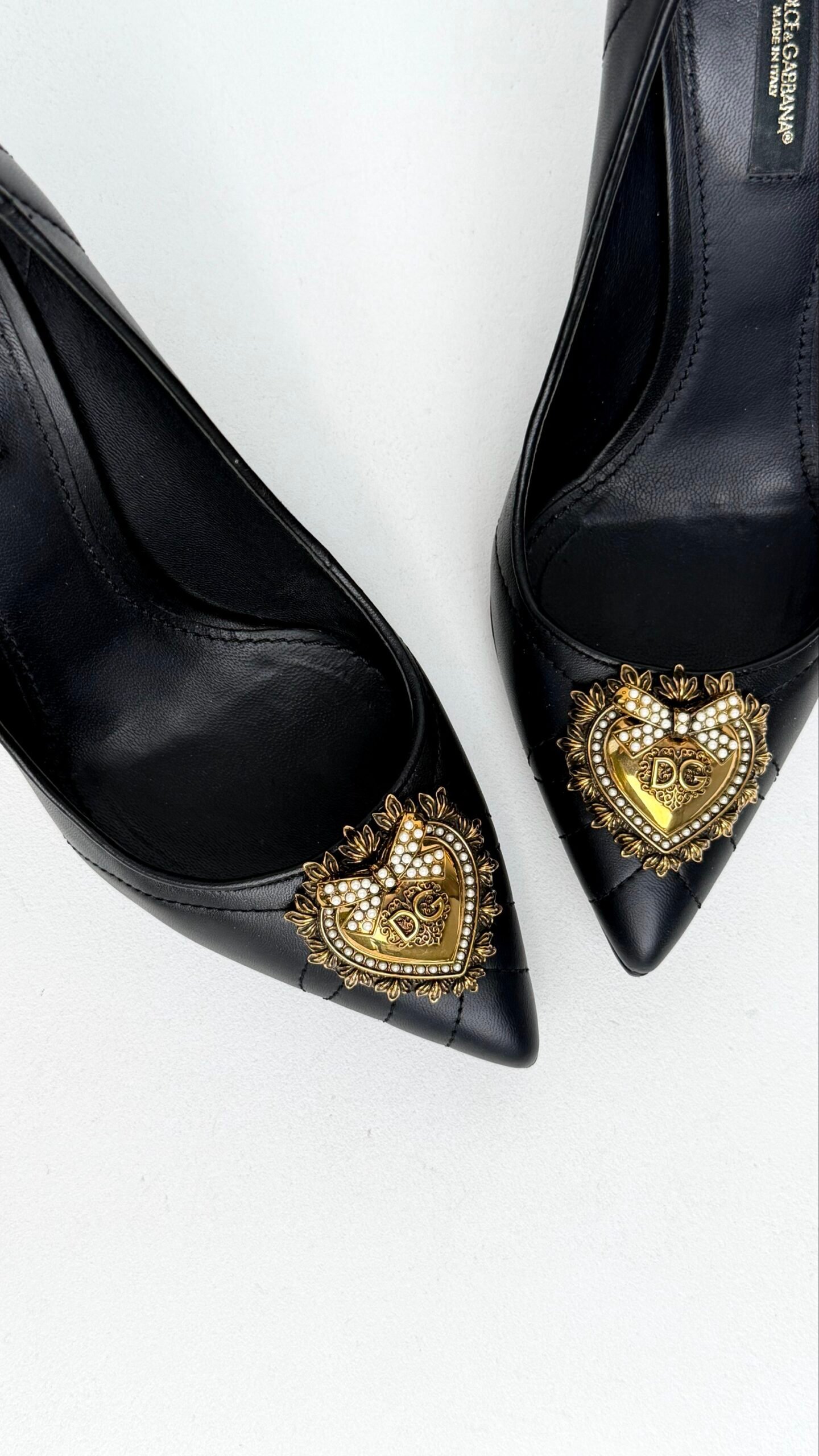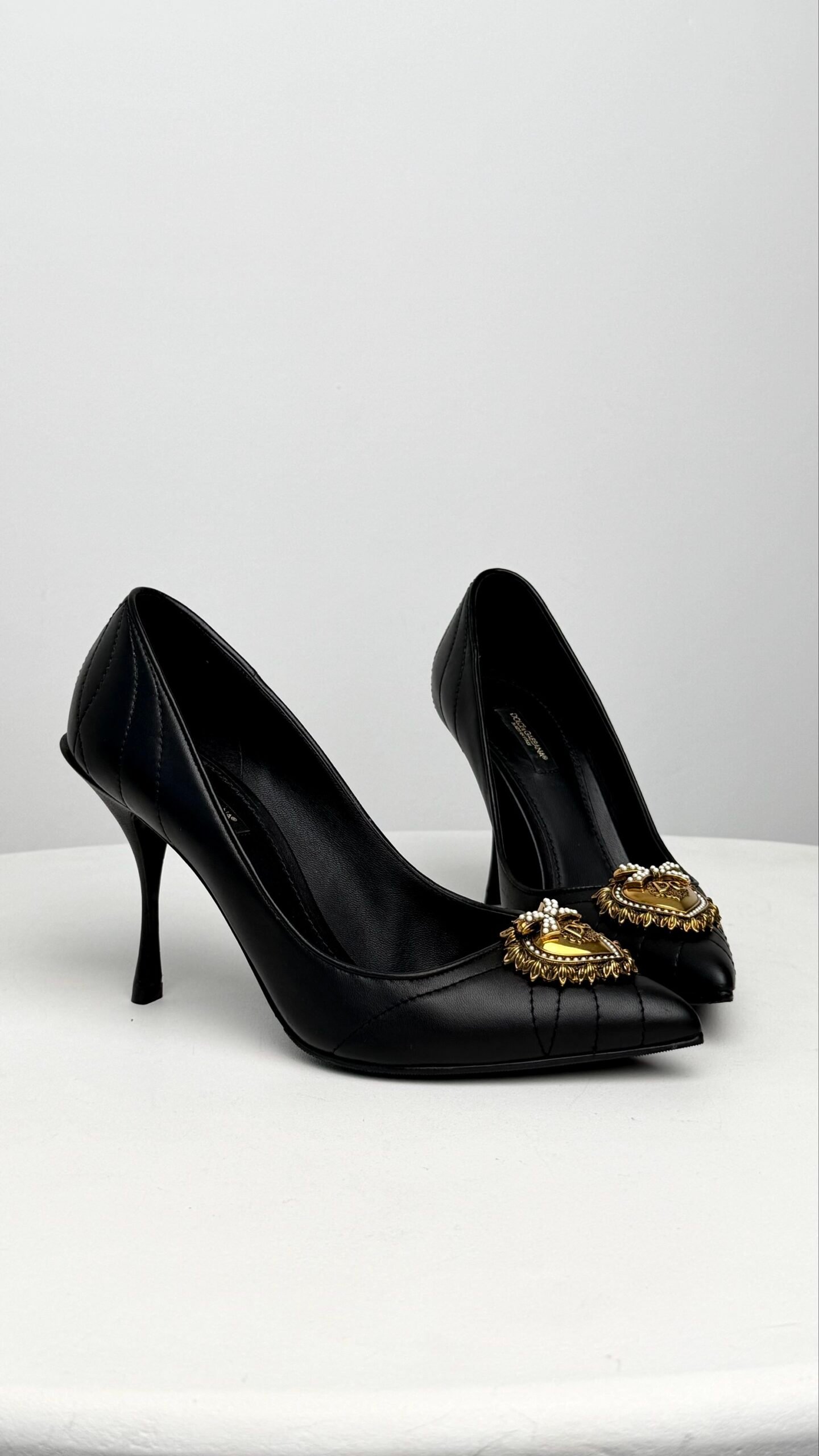 Ці туфлі — втілення італійської пристрасті та безумовної елегантності. Модель із культової лінійки Devotion вирізняється не лише витонченим силуетом, а й ювелірним декором. Центральним елементом є розкішне металеве серце, виготовлене методом точного лиття, прикрашене перлинами та фірмовим монограмним логотипом. М’яка шкіра зі стьобаним ефектом додає фактурності, перетворюючи класичні чорні човники на справжній арт-об’єкт.