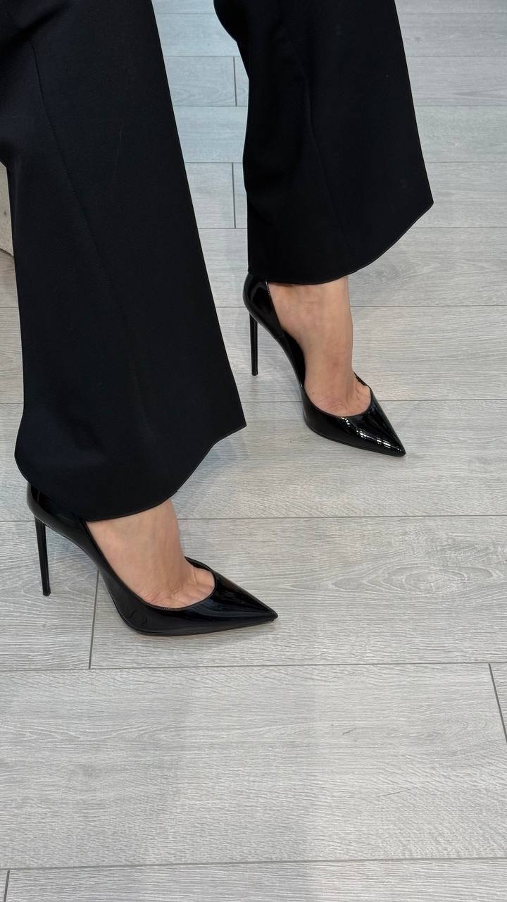 Класичні туфлі Saint Laurent виготовлені з лакованої чорної шкіри, мають гострий носок і високий тонкий підбор, що візуально подовжує силует