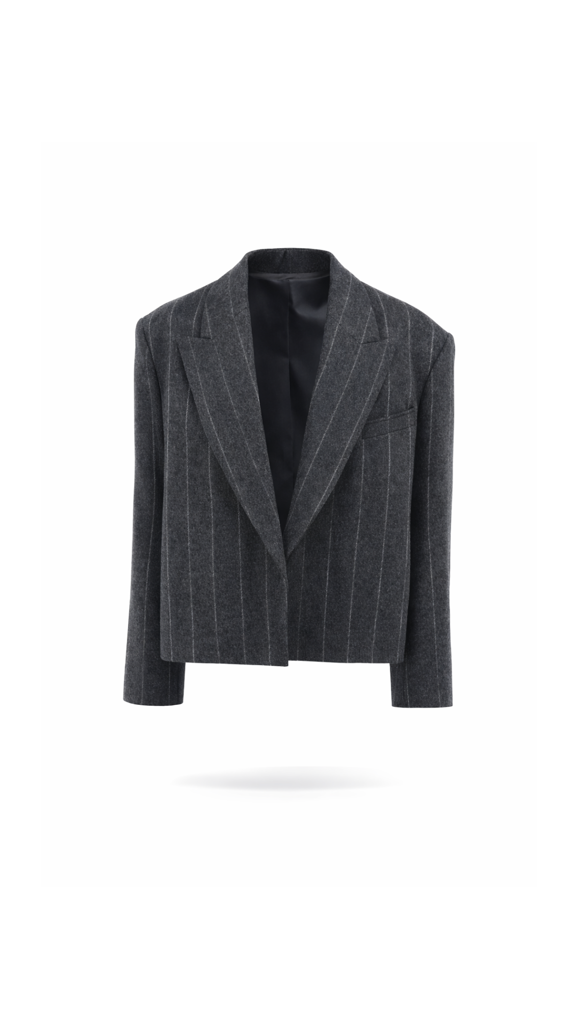 Елегантність зустрічається з оверсайз-трендами у цьому вкороченому жакеті від бренду Bazhane. Виконаний із преміальної 100% вовни , він поєднує в собі структурність класичного тейлорингу та розслабленість сучасного стилю. Графітовий колір у тонку вертикальну смужку візуально витягує силует, а акцентні плечі додають образу характеру та впевненості.
