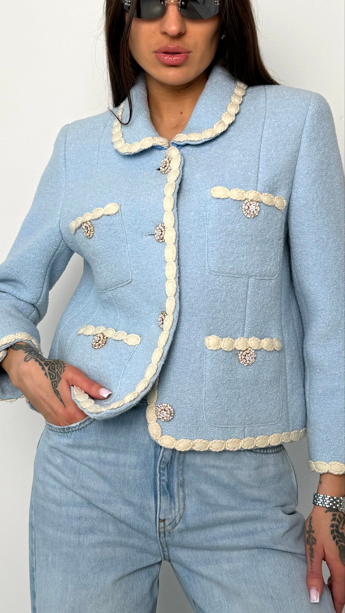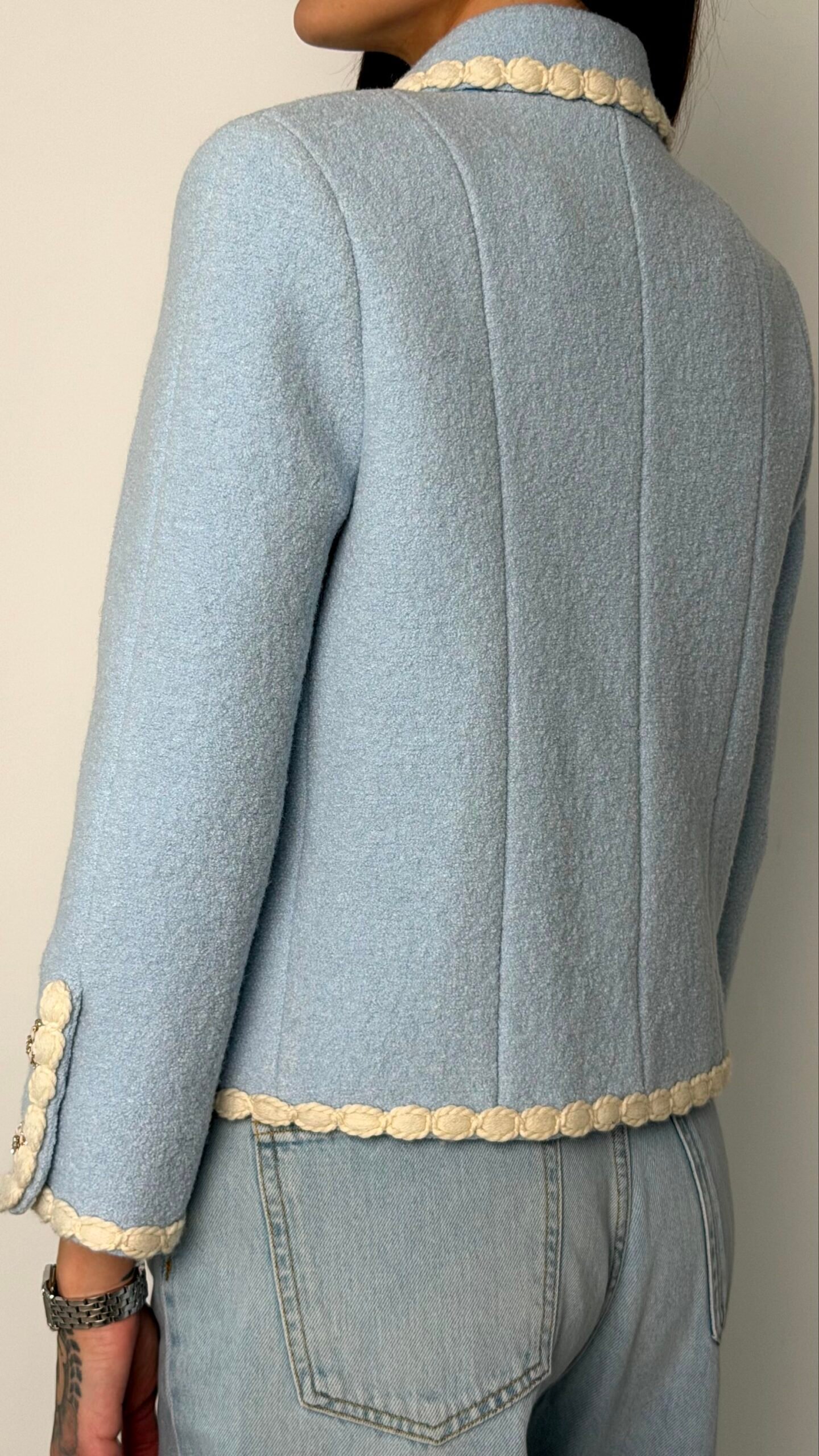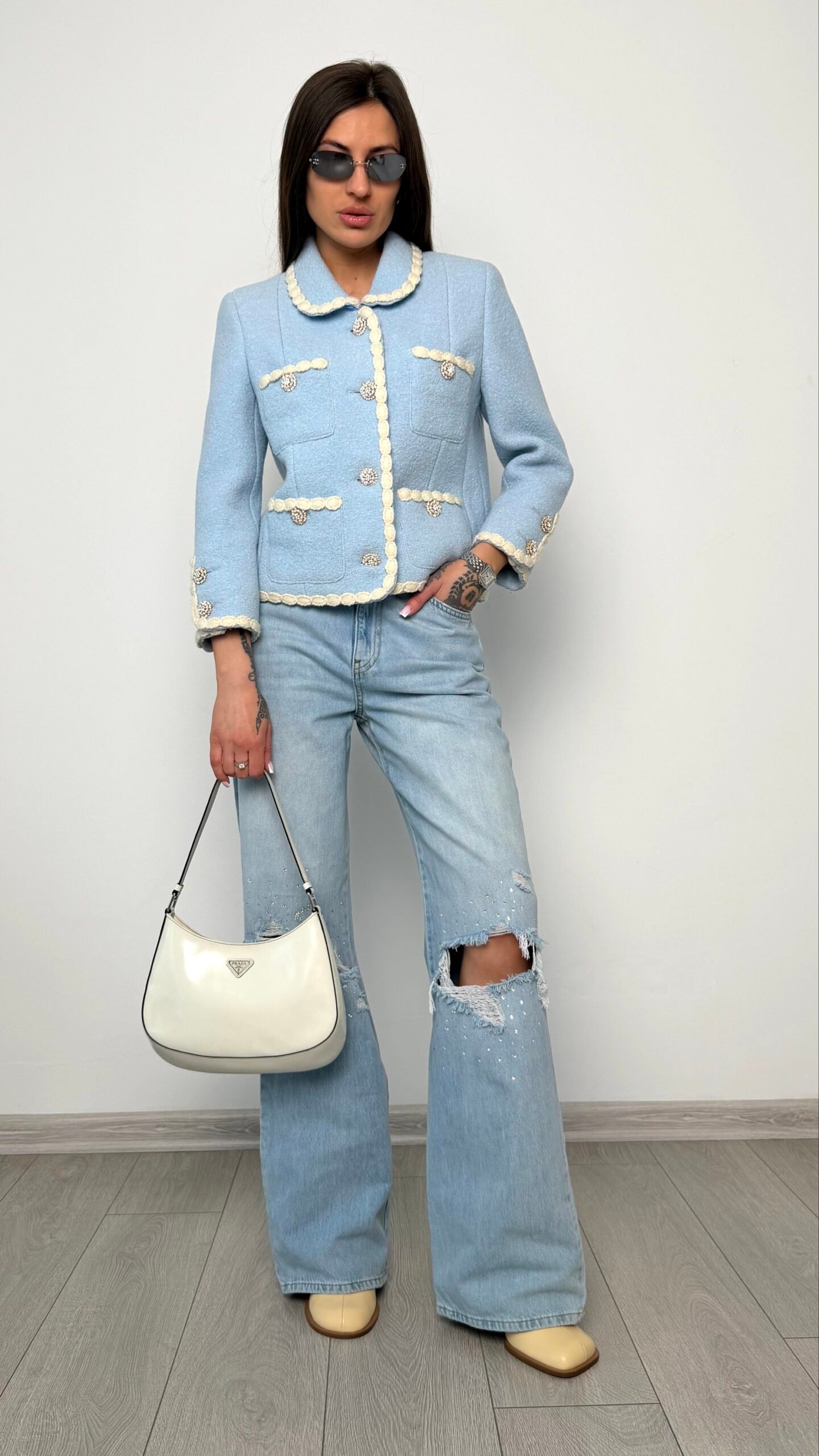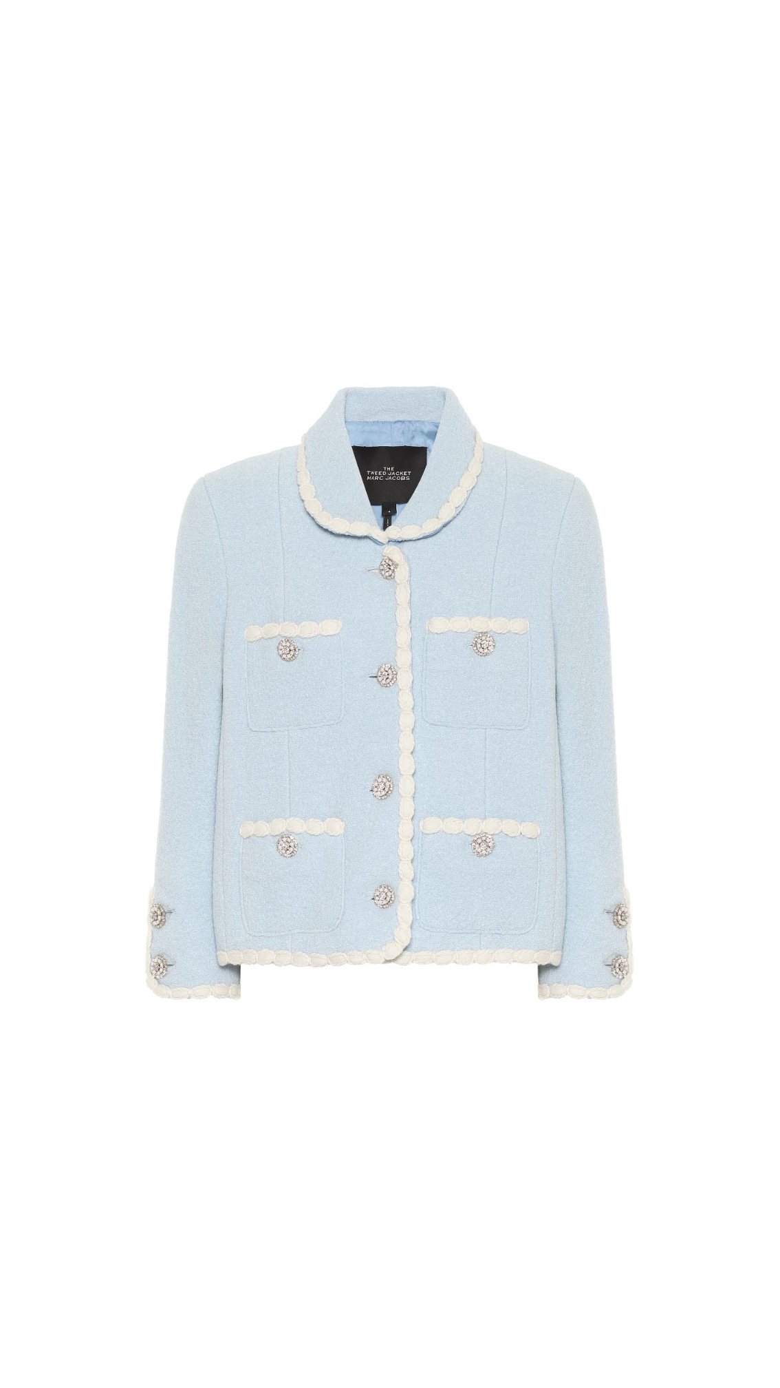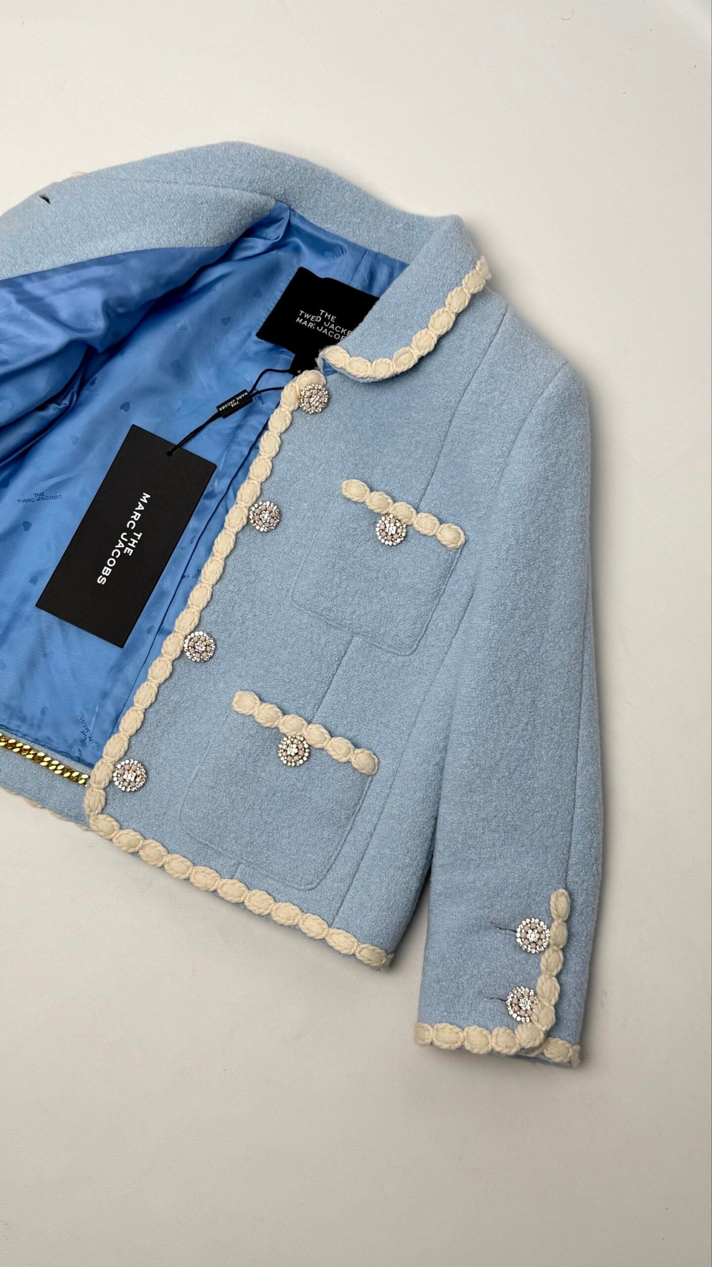 Додайте нотку класичної елегантності у свій гардероб за допомогою цього вишуканого жакета від Marc Jacobs. Модель виконана з фактурного твіду ніжно-блакитного відтінку, що ідеально поєднує в собі ретро-естетику та сучасний шик.