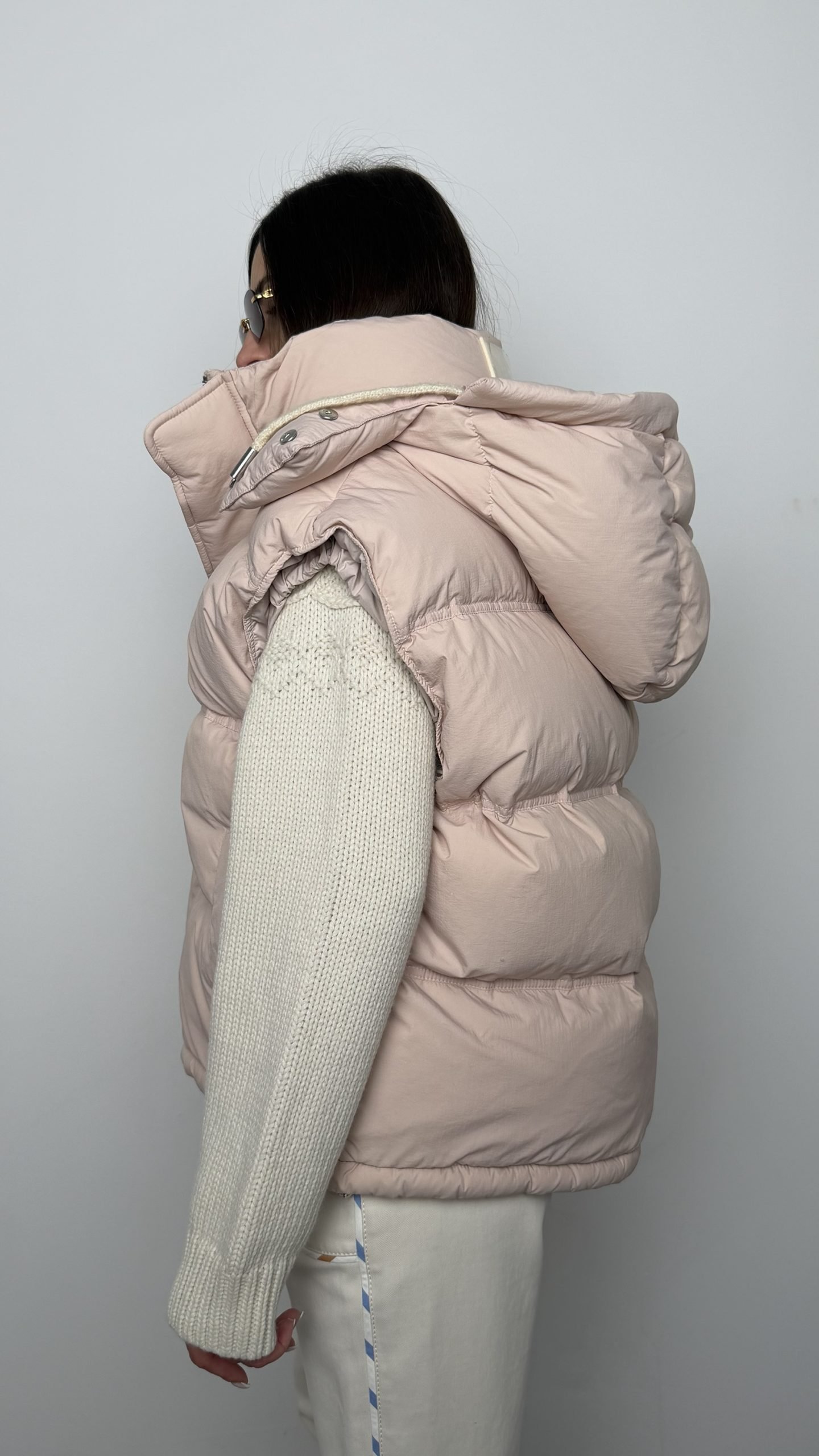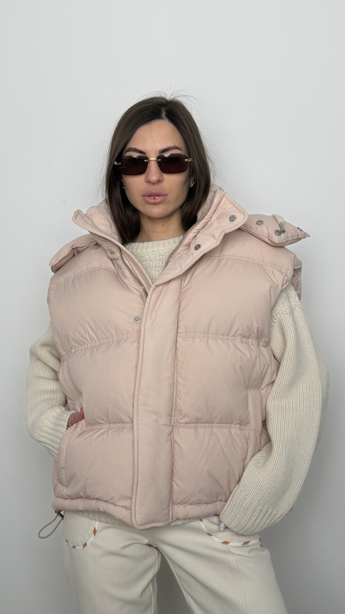 Жилет Ami Paris — легкий та теплий пуховий жилет у ніжному відтінку. Наповнення 90% пух / 10% перо забезпечує комфорт і тепло без зайвого обʼєму. Сучасний oversize-силует ідеально вписується в повсякденні образи та layering у стилі casual chic.